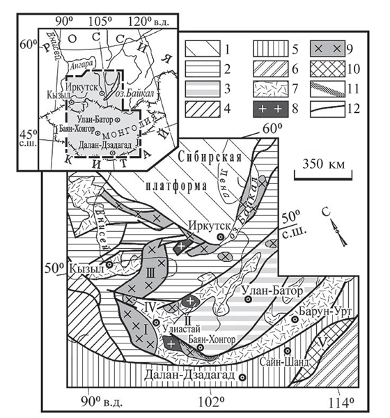 1 – древние платформы; 2–10 – структуры Центрально-Азиатского складчатого пояса: 2 – ранние каледониды, 3 – нерасчлененные толщи турбидитного чехла палеозоя, 4 – поздние каледониды; 5 – герциниды, 6 – индосиниды, 7 – вулканические пояса позднего палеозоя–мезозоя, 8–10 – фрагменты континентальных массивов: 8а – с нерасчлененным ранне- и позднедокембрийским основанием, 8б – с раннедокембрийским основанием, 9 – с раннебайкальским основанием, 10 – с гренвильским основанием; 11 – Южно-Хангайский метаморфический пояс; 12 – главные тектонические границы. Римскими цифрами обозначены: I – Дзабханский микроконтинент, II – блоки Тарбагатайского выступа, III – Тувино-Монгольский террейн, IV – блоки Сонгинского выступа, V – Южно-Гобийский микроконтинент.