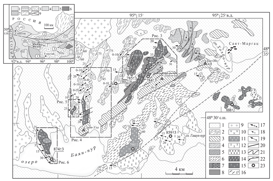 1 – четвертичные рыхлые отложения; 2 – породы гнейсо-мигматитового баяннурского комплекса (802 ± 6 млн лет); 3–7 – холбонурский комплекс: 3 – толща “апобазальтовых” сланцев с редкими прослоями кремнистых пород и телами габброидов, 4 – сланцы (метавулканиты основного и среднего состава) с горизонтами кварцитов и прослоями кремнистых пород, 5 – сланцы (метавулканиты основного и среднего состава) с горизонтами кварцитов и слюдистых кварцито-сланцев, с пластами и линзами мраморизованных известняков, 6 – породы аккреционной призмы: аргиллиты, песчаники, гравелиты, конгломераты, 7 – породы островодужной ассоциации: песчаники, гравелиты, конгломераты, олистолиты, базальты; 8 – амфиболиты, амфиболовые гнейсы и кристаллические сланцы; 9–15 – магматические породы:9 – массивные граниты (карбон–пермь), 10 – массивные гранодиориты (ранний–средний палеозой?), 11 – позднерифейские граниты Баяннурского массива (790 ± 3 млн лет), 12 – массивные роговообманковые гранодиориты, диориты Гашуннурского массива (859 ± 3 млн лет), 13 – те же породы (?) сильно измененные (эпидотизация, хлоритизация), 14 – роговообманковое габбро и диориты (785 ± 3 млн лет), 15 – породы тектонических пластин: серпентинизированные пироксениты, вебстериты, верлиты; дуниты, расслоенное габбро, серпентиниты, амфиболиты; 16 – ориентировка сланцеватости (вертикальная, наклонная, субгоризонтальная); 17 – шарниры складок, линейность в баяннурском комплексе; 18 – шарниры мелких складок, линейность в толще метавулканитов; 19 – ориентировка структур, сопряженных с надвигами: линейность, бороздчатость, зеркала скольжения; 20 – главные сдвиговые зоны и тектонические границы; 21 – деформированные тектонические границы; 22 – надвиги; 23 – положение геохронологических проб (возраст в млн лет).