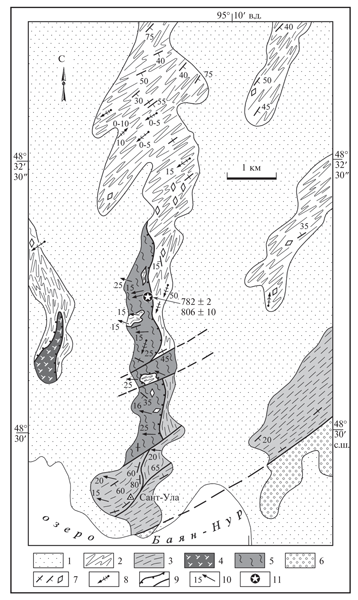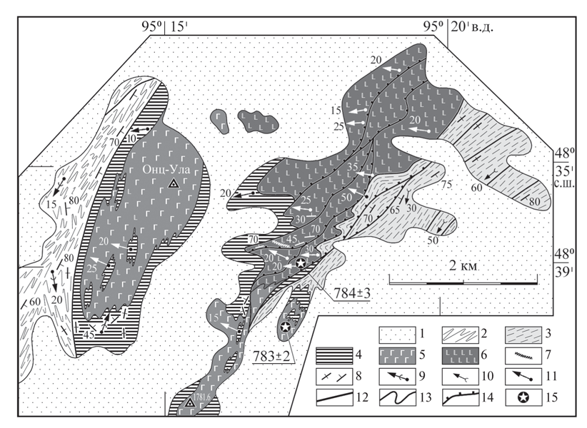 1 – четвертичные отложения; 2 – метаморфические породы баяннурского комплекса; 3 – сланцы (метавулканиты основного и среднего состава) с горизонтами кварцитов и прослоями кремнистых пород; 4 – амфиболиты, амфиболовые гнейсы и кристаллические сланцы; 5 – роговообманковое габбро и диориты (785 ± 3 млн лет); 6 – анортозиты (784 ± 3 млн лет); 7 – габбро, гипербазиты; 8 – ориентировка сланцеватости (вертикальная, наклонная); 9 – шарниры складок, линейность в гнейсо-мигматитовом комплексе; 10 – шарниры мелких складок, линейность в амфиболитах и сланцах обрамления габбро-гипербазитового комплекса; 11 – ориентировка структур, сопряженных с надвигами (линейность, бороздчатость, зеркала скольжения); 12 – сдвиговые зоны и тектонические границы; 13 – деформированные тектонические границы; 14 – надвиги (N); 15 – положение геохронологических проб (возраст в млн лет).