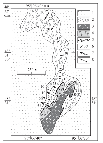 1 – четвертичные рыхлые отложения; 2 – мигматизированные гнейсы баяннурского комплекса; 3 – расслоенное габбро, гипербазиты, серпентиниты; 4 – породы зоны тектонического переслаивания серпентинитов, амфиболитов, бластомилонитов по расслоенному габбро, мигматитам и гнейсам баяннурского комплекса; 5 – положение поверхности надвига; 6 – сланцеватость (вертикальная, наклонная, субгоризонтальная); 7 – шарниры складок, линейность; 8 – ориентировка бороздчатости и плоскостей скольжения.