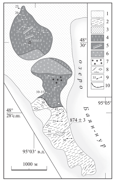 Рис. 2. Схема геологического строения Баяннурского блока Сонгинского выступа.