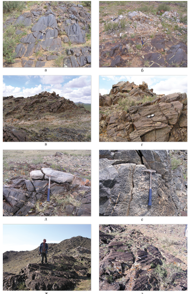 Рис. 7. Структурные соотношения пород габбро-гипербазитового комплекса тектонических пластин Баяннурского блока (фотографии обнажений).