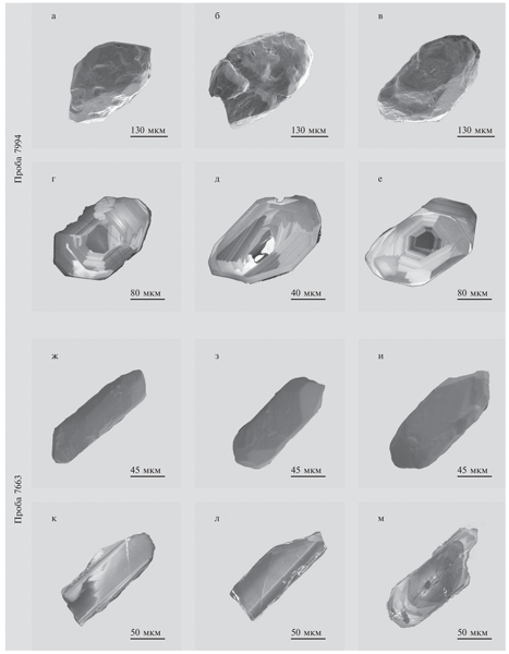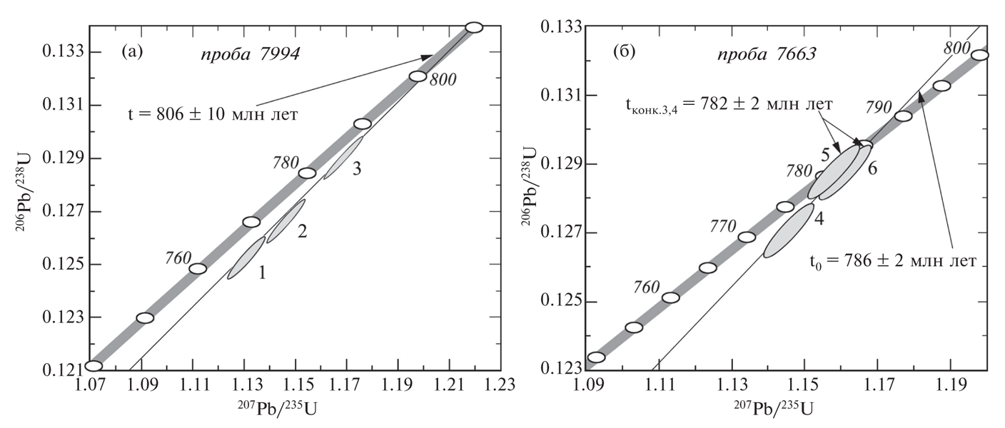Акцессорный циркон пробы 7994 представлен субидиоморфными полупрозрачными короткопризматическими кристаллами светло-желтой окраски. Кристаллы огранены сочетанием призм {100}, {110} и дипирамид {101}, {111}, {211} (рис. 8а–8в). Размер кристаллов изменяется от 30 до 300 мкм, Кудл. составляет 1.0–1.2. В режиме катодолюминесценции в цирконе наблюдается осцилляторная зональность и секториальность (рис. 8г–8е). Для изотопных исследований нами был использован как необработанный циркон, так и циркон, предварительно подвергнутый аэроабразивной и кислотной обработкам (табл. 1, № 1–3). Изученный циркон характеризуется незначительной возрастной дискордантностью (3–1.2%), а точки его изотопного состава располагаются на дискордии, верхнее пересечение которой с конкордией отвечает возрасту 806 ± 10 млн лет (нижнее пересечение 343 ± 160 млн лет, СКВО = 0.73; рис. 9а). Морфологические особенности изученного циркона указывают на его магматическое происхождение, следовательно, оценку 806 ± 10 млн лет можно использовать в качестве возраста его кристаллизации.