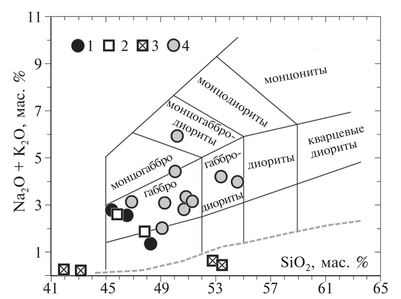 На дискриминационных диаграммах (рис. 14) точки составов постнадвиговых высокотитанистых габбро и габбро-диоритов находятся в полях активных континентальных окраин и вулканических дуг, зон внутриплитного магматизма и базальтов срединно-океанических хребтов. По классификации островодужных и континентальных базальтов (Великославинский, Глебовицкий, 2005) большинство габброидов попадают в поле составов вулканических дуг.