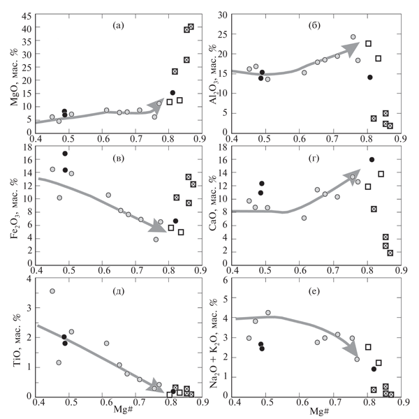 Постнадвиговые высокотитанистые габброиды характеризуются отрицательными величинами eNd(0.8) от –3.1 до –4.1 (табл. 3), что свидетельствует об обогащенном мантийном источнике расплавов или контаминации базитовых расплавов материалом, близким к метатерригенным породам баяннурского комплекса (Ярмолюк и др., 2017). В противоположность этому, низкотитанистые габбро и габбро-диориты обладают положительными величинами eNd(0.8) от +2.5 до +2.8, отражающими умеренно деплетированный мантийный источник. Принимая во внимание посттектоническую природу рассматриваемых габброидов, совместное нахождение высоко- и низкотитанистых разностей и их одинаковое структурное положение, можно предполагать, что формирование родоначальных расплавов рассматриваемых габброидов происходило при плавлении деплетированного мантийного источника (мантийного клина) под воздействием плюмового источника.