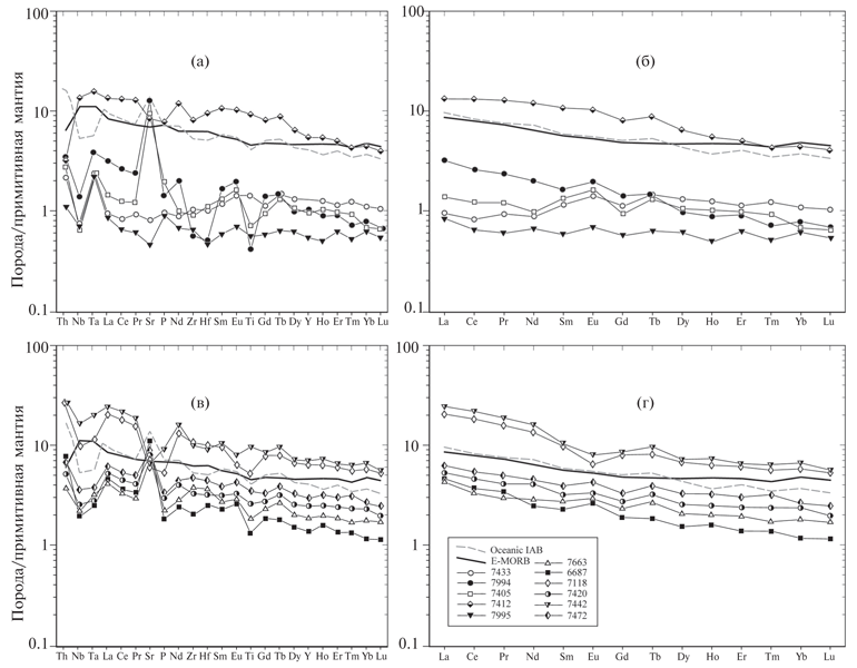 Постнадвиговые габбро и габбро-диориты характеризуются более фракционированным распределением редких элементов с отрицательными аномалиями Ta–Nb (рис. 12в, 12г). Высокотитанистые габброиды отличаются от низкотитанистых более высокими содержаниями редких элементов, их несколько более фрак.ционированным характером, отрицательными аномалиями Sr. Как высокотитанистые, так и низкотитанистые габброиды обладают слабо фракционированным распределением РЗЭ с обогащением легкими и обеднением тяжелыми РЗЭ ((La/Yb)N = 2.07–3.9, (Gd/Yb)N = 1.17–1.61). Для высокотитанистых габбро характерны слабые отрицательные аномалии Eu (Eu/Eu* = 0.73–0.85), а для низкотитанистых габбро – слабые положительные (Eu/Eu* = 1.2–1.45; рис. 12г).