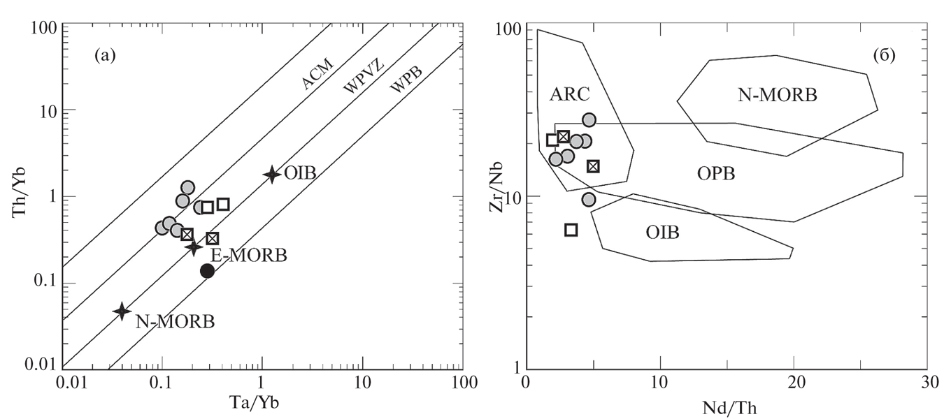 Рис. 13. Положение составов габбро-гипербазитового комплекса на дискриминационных диаграммах (а) Th/Yb–Ta/Yb (Wood, 1980) и (б) Zr/Nb–Nd/Th (Meschede, 1986).