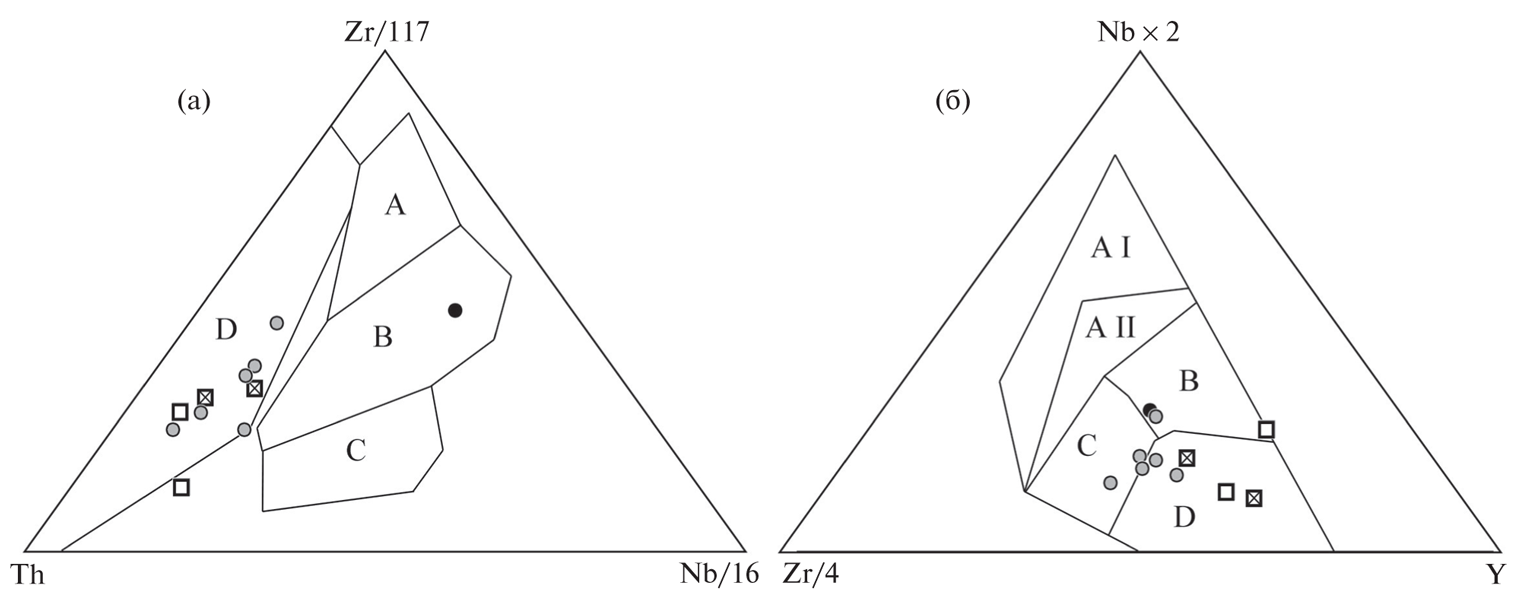 (а): A – N-MORB; B – E-MORB и внутриплитные базальты; C – внутриплитные щелочные базальты; D – базальты островных дуг. (б): AI – внутриплитные щелочные базальты; AII – внутриплитные щелочные базальты и толеиты; B – базальты срединно-океанических хребтов (E-MORB); C – внутриплитные толеиты и базальты вулканических дуг; D – базальты срединно-океанических хребтов (N-MORB). Условные обозначения см. на рис. 10.