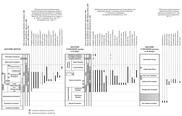 Значительный вклад в изучение разнообразия кембрийских моллюсков Австралии внесли монографические работы по нижнему кембрию Южной Австралии (Bengtson et al., 1990; Gravestock et al., 2001). В результате были описаны более 40 видов моллюсков из раннекембрийских седиментационных бассейнов Стэнсбери и Эрроуи. Анализ стратиграфического распространения видов моллюсков послужил основой первой стратиграфической схемы региона по данной группе фауны (Gravestock et al., 2001).