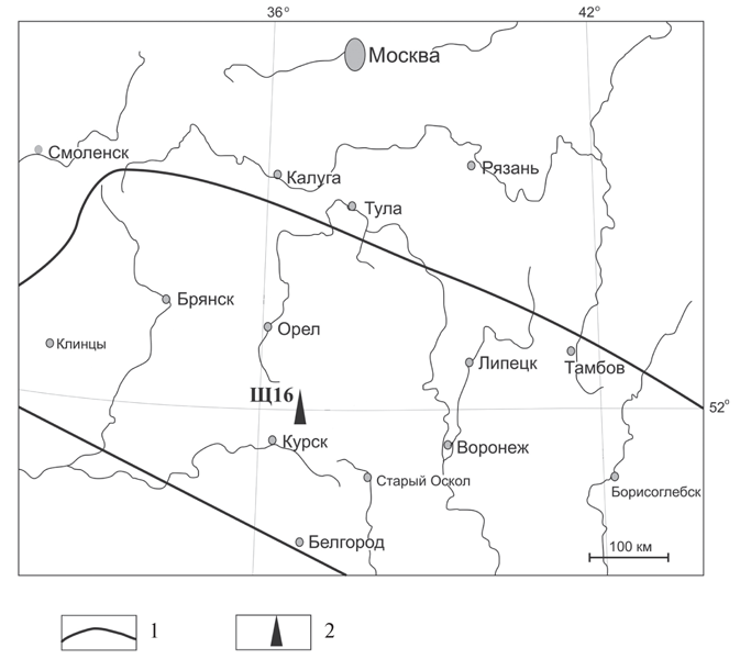 1 – границы Воронежской антеклизы, 2 – скважина (Назарова, Кононова, 2016, с изменениями).