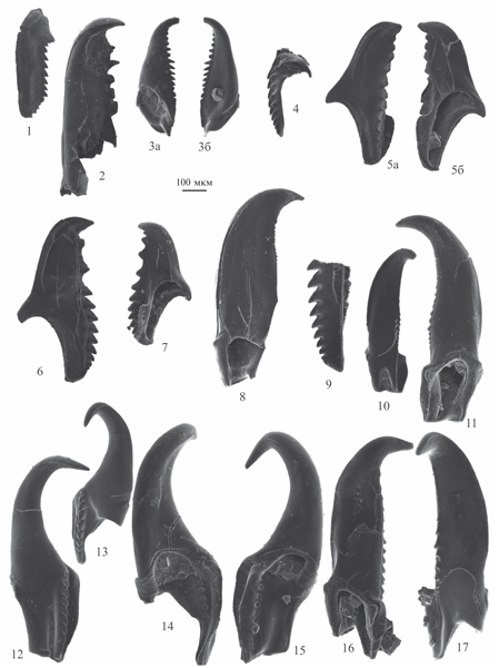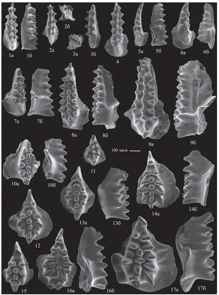 1–4 – Icriodus vitabilis Naz.: 1 – экз. № МГУ 272/839: 1а – вид сверху, 1б – вид сбоку, саргаевский горизонт, гл. 115.6 м, обр. Щ-16/212а; 2 – экз. № МГУ 272/795: 2а – вид сверху, 2б – вид с переднего конца, образец тот же; 3 – экз. № МГУ 272/796: 3а – вид с переднего конца, 3б – вид сверху, семилукский горизонт, инт. 91.25–96.15 м, обр. Щ-16/33; 4 – экз. № МГУ 272/849, вид сверху, семилукский горизонт, инт. 96.15–101.05 м, обр. Щ-16/37; 5–6 – I. interjectus Kuzm. et Ovn.: 5 – экз. № МГУ 272/869: 5а – вид сверху, 5б – вид сбоку, семилукский горизонт, инт. 91.25–96.15 м, обр. Щ-16/27; 6 – экз. № МГУ 272/866: 6а – вид сверху, 6б – вид сбоку, образец тот же; 7–8 – I. expansus Br. et Mehl: 7 – экз. № МГУ 272/832: 7а – вид сверху, 7б – вид сбоку, тиманский горизонт, инт. 120.65–125.55 м, обр. Щ-16/98; 8 – экз. № МГУ 272/840: 8а – вид сверху, 8б – вид сбоку, саргаевский горизонт, гл. 115.6 м, обр. Щ-16/212а; 9 – I. symmetricus Br. et Mehl, экз. № МГУ 272/836: 9а – вид сверху, 9б – вид сбоку, семилукский горизонт, инт. 91.25–96.15 м, обр. Щ-16/33; 10–17 – I. xenium Naz.: 10 – экз. № МГУ 272/831: 10а – вид сверху, 10б – вид сбоку, тиманский горизонт, инт. 120.65–125.55 м, обр. Щ-16/98; 11 – экз. № МГУ 272/829, вид сверху, образец тот же; 12 – экз. № МГУ 272/828, вид сверху, образец тот же; 13 – экз. № МГУ 272/834: 13а – вид сверху, 13б – вид сбоку, саргаевский горизонт, инт. 115.75–120.65 м, обр. Щ-16/87; 14 – экз. № МГУ 272/835: 14а – вид сверху, 14б – вид сбоку, образец тот же; 15 – экз. № МГУ 272/833, вид сверху, образец тот же; 16 – экз. № МГУ 272/830: 16а – вид сверху, 16б – вид сбоку, образец тот же; 17 – экз. № МГУ 272/837: 17а – вид сверху, 17б – вид сбоку, образец тот же.
