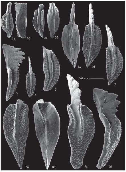 1 – Polygnathus posterus Kuzm., экз. № МГУ 272/858: 1а – вид сверху, 1б – вид сбоку, инт. 115.75–120.65 м, обр. Щ-16/84; 2 – Р. lanei Kuzm., экз. № МГУ 272/860: 2а – вид сверху, 2б – вид снизу, интервал тот же, обр. Щ-16/83; 3, 4 – P. pollocki Druce: 3 – экз. № МГУ 272/827, вид сбоку, инт. 110.85–115.75, обр. Щ-16/67; 4 – экз. № МГУ 272/862, вид сверху, инт. 105.95–110.85 м, обр. Щ-16/64; 5 – P. ljaschenkoi Kuzm., экз. № МГУ 272/863, вид сверху, инт. 115.75–120.65 м, обр. Щ-16/85; 6–9 – P. reimersi Kuzm.: 6 – экз. № МГУ 272/875: 6а – вид снизу, 6б – вид сверху, инт. 101.05–105.95 м, обр. Щ-16/52; 7 – экз. № МГУ 272/883, вид сверху, инт. 105.95–110.85 м, обр. Щ-16/63; 8 – экз. № МГУ 272/881: 8а – вид сверху, 8б – вид снизу, инт. 110.85–115.75 м, обр. Щ-16/67; 9 – экз. № МГУ 272/882: 9а – вид сверху, 9б – вид сбоку, образец тот же.