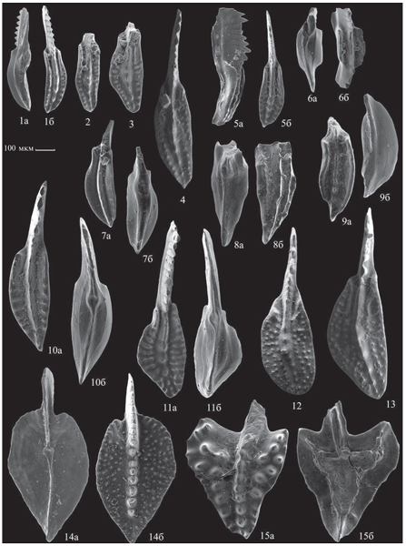 1–4 – P. lingulatus Ovn.: 1 – экз. № МГУ 272/864: 1а – вид снизу, 1б – вид сверху, семилукский горизонт, гл. 95.5 м, обр. Щ-16/207а; 2 – экз. № МГУ 272/861, вид сверху, образец тот же; 3 – экз. № МГУ 272/865, вид сверху, семилукский горизонт, инт. 91.25–96.15 м, обр. Щ-16/35; 4 – экз. № МГУ 272/867, вид сверху, семилукский горизонт, гл. 91.0 м, обр. Щ-16/206а; 5 – P. pseudoxylus Konon. et al., экз. № МГУ 272/868: 5а – вид сбоку, 5б – вид сверху, семилукский горизонт, инт. 91.25–96.15 м, обр. Щ-16/26; 6 – Ct. angustidiscus (Youngq.), экз. № МГУ 272/871: 6а – вид снизу, 6б – вид сверху, саргаевский горизонт, инт. 115.75–120.65 м, обр. Щ-16/84; 7 – P. praepolitus Ovn. et Konon., экз. № МГУ 272/859: 7а – вид сверху, 7б – вид снизу, семилукский горизонт, инт. 91.25–96.15 м, обр. Щ-16/28; 8 – P. efimovae Konon. et al., экз. № МГУ 272/872: 8а – вид снизу, 8б – вид сверху, семилукский горизонт, интервал тот же, обр. Щ-16/23; 9 – P. aspelundi Sav. et Fun., экз. № МГУ 272/878: 9а – вид сверху, 9б – вид снизу, семилукский горизонт, инт. 86.35–91.25 м, обр. Щ-16/17; 10 – P. dubius Hinde, экз. № МГУ 272/874: 10а – вид сверху, 10б – вид снизу, саргаевский горизонт, инт. 115.75–120.65 м, обр. Щ-16/85; 11 – P. webbi Stauff., экз. № МГУ 272/870: 11а – вид сверху, 11б – вид снизу, семилукский горизонт, инт. 96.15–101.05 м, обр. Щ-16/38; 12, 13 – P. rudkinensis Ovn.: 12 – экз. № МГУ 272/880, вид сверху, семилукский горизонт, инт. 91.25–96.15 м, обр. Щ-16/33; 13 – экз. № МГУ 272/876, вид сверху, семилукский горизонт, гл. 91.0 м, обр. Щ-16/206а; 14 – Mesotaxis falsiovalis Sandb. et al., экз. № МГУ 272/877: 14а – вид снизу, 14б – вид сверху, саргаевский горизонт, инт. 110.85–115.75 м, обр. Щ-16/67; 15 – Ancyrodella rugosa Br. et Mehl, экз. № МГУ 272/873: 15а – вид сверху, 15б – вид снизу, семилукский горизонт, инт. 91.25–96.15 м, обр. Щ-16/26.