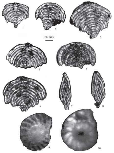 1 – Semitextularia virgulina E. Bykova, экз. МГУ № 272/889, вид сбоку, семилукский горизонт, гл. 91.0 м, обр. Щ-16/206а; 2 – S. sigillaria curta E. Bykova, экз. МГУ № 272/890, вид сбоку, образец тот же; 3 – S. sigillaria voronezhensis E. Bykova, экз. МГУ № 272/891, вид сбоку, образец тот же; 4 – S. sp. 1, экз. МГУ № 272/892, вид сбоку, образец тот же; 5 – S. aff. natiopsis E. Bykova, экз. МГУ № 272/893, вид сбоку, образец тот же; 6 – S. semilukiensis E. Bykova, экз. МГУ № 272/894, вид сбоку, образец тот же; 7 – Pseudopalmula fragaria triangularia E. Bykova, экз. МГУ № 272/895, вид сбоку, образец тот же; 8 – P. аff. fragaria E. Bykova, экз. МГУ № 272/896, вид сбоку, образец тот же; 9 – Nanicella eugeni N. Tchernysheva, экз. МГУ № 272/897, вид сбоку, саргаевский горизонт, инт. 105.95–110.85 м, обр. Щ-16/62; 10 – N. tchernyshevae Lipina, экз. МГУ № 272/898, вид сбоку, образец тот же.