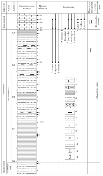 В саргаевском горизонте скв. 178 Средний Карачан присутствуют A. rotundiloba alata, M. asymmetrica (=P. asymmetricus asymmetricus), P. xylus xylus, Ct. angustidiscus, I. symmetricus, I. expansus. После выхода в свет монографии В.А. Аристова (1988) были описаны новые роды и виды конодонтов, поэтому в приведенных списках в скобках указаны устаревшие названия. В скв. 16 Щигры саргаевский комплекс конодонтов значительно беднее, что обусловлено положением скважины на более мелководном участке саргаевского моря. В скв. 178 Средний Карачан саргаевский комплекс конодонтов содержит представителей Mesotaxis и Ancyrodella – показателей относительно более глубоководного участка бассейна.