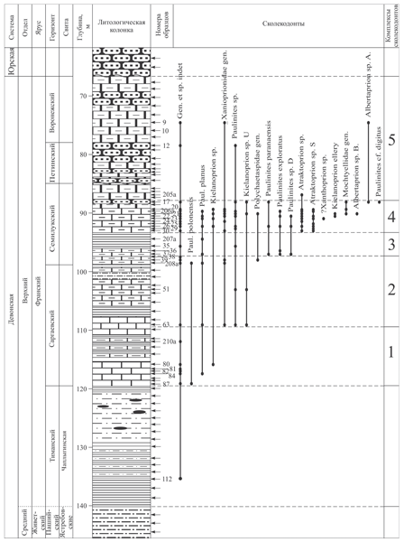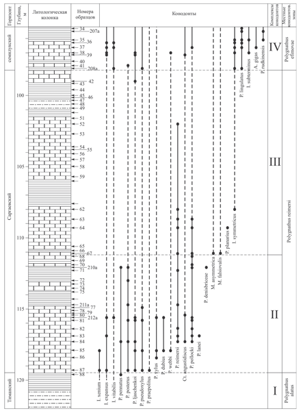 Учитывая состав комплексов II и III конодонтов, отнесенных к зоне P. reimersi, характеризующей саргаевский горизонт, мы можем дополнить характеристику зонального комплекса следующими видами: I. xenium, I. expansus, I. vitabilis, I. symmetricus, P. denisbriceae, P. lanei, P. planarius.