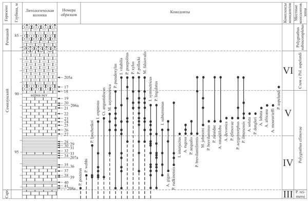 В воронежском горизонте в рассматриваемой скважине встречены единичные экземпляры вида P. unicornis, характерного для зоны P. subincompletus. Эта зона была выделена в петинско-воронежских отложениях в скв. 3/72 Усмань (инт. 95–122 м) Воронежской антеклизы, а также в скв. 120260 Осетровская (инт. 490–530 м) Московской синеклизы (Ovnatanova, Kononova, 2001). Нижняя граница зоны отмечена появлением P. subincompletus Ovnatanova et Kononova и P. politus Ovnatanova et Kononova. Другими характерными видами являются P. alvenus Ovnatanova et Kononova, P. torosus Ovnatanova et Kononova, P. unicornis и Palm. semichatovae Ovnatanova. В верхней части зоны P. subincompletus появляются P. costulatus Аristov, P. churkini Savage et Funai. Продолжают встречаться Ancyrognathus ancyrognathoides, P. aspelundi, P. azygomorphus. В конце зоны исчезают P. seraphimae и P. zinaidae. Зона P. subincompletus коррелируется с зоной Early rhenana (Ovnatanova, Kononova, 2001, 2008).