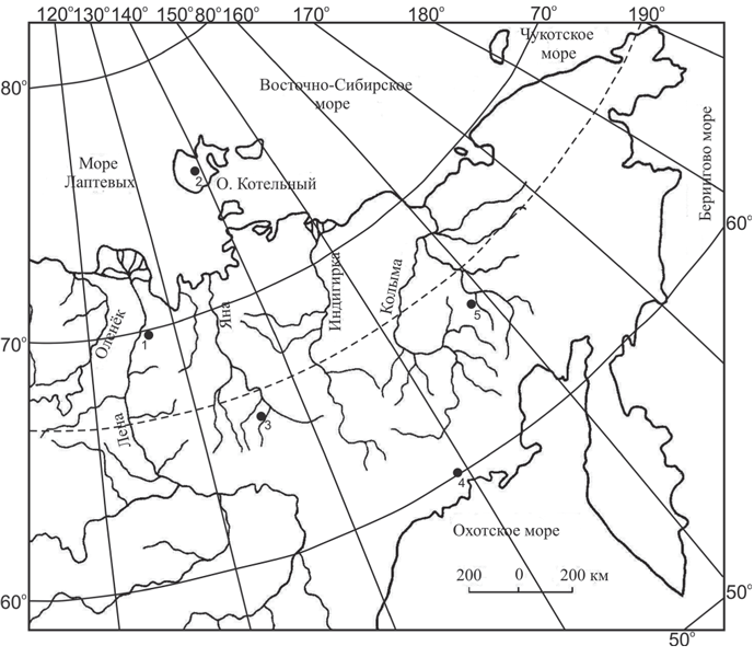 1 – Северное Верхоянье, р. Даркы; 2 – о-в Котельный, реки Тихая, Прямая; 3 – бассейн р. Адыча, среднее течение р. Дербеке, в 10 км выше устья руч. Молтыркан; 4 – Северное Приохотье, бассейн р. Яна Охотская, р. Вторая Сентябрьская; 5 – Омолонский массив, р. Омкучан.