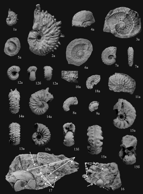 1 – голотип № 1/55, Янское нагорье, бассейн р. Нельгехе, р. Силир; 2 – тот же экз. (×3); 3 – экз. № 30/2082, Северное Приохотье, бассейн р. Яна Охотская, р. Вторая Сентябрьская; 4 – экз. № 29/2082, местонахождение фиг. 4–8 то же; 5 – экз. № 24/2082; 6 – экз. № 26/2082; 7 – экз. № 28/2082; 8 – экз. № 25/2082; 9 – экз. № 39/2082, о-в Котельный, р. Тихая; 10 – экз. № 37/2082, местонахождение фиг. 10–17 то же; 11 – экз. № 38/2082; 12 – экз. № 33/2082 (×3); 13 – экз. № 34/2082 (×3); 14 – экз. № 35/2082 (×3); 15 – экз. № 36/2082 (×3); 16 – образец глинистого известняка с молодыми экземплярами Y. (V.) armiger (показаны жирными пунктирными стрелками) в комплексе с Sirenites senticosus (Dittmar) (отпечаток показан сплошной стрелкой), Proarcestes sp. juv. (раковина показана тонкой пунктирной стрелкой) и Yakutosirenites? sp. (вверху справа); 17 – образец глинистого известняка с молодыми экземплярами Y. (V.) armiger (показаны жирными пунктирными стрелками) в комплексе с Sirenites senticosus (Dittmar) (раковина и отпечатки показаны сплошными стрелками); 18 – экз. № 40/2082, Северное Верхоянье, р. Даркы.
