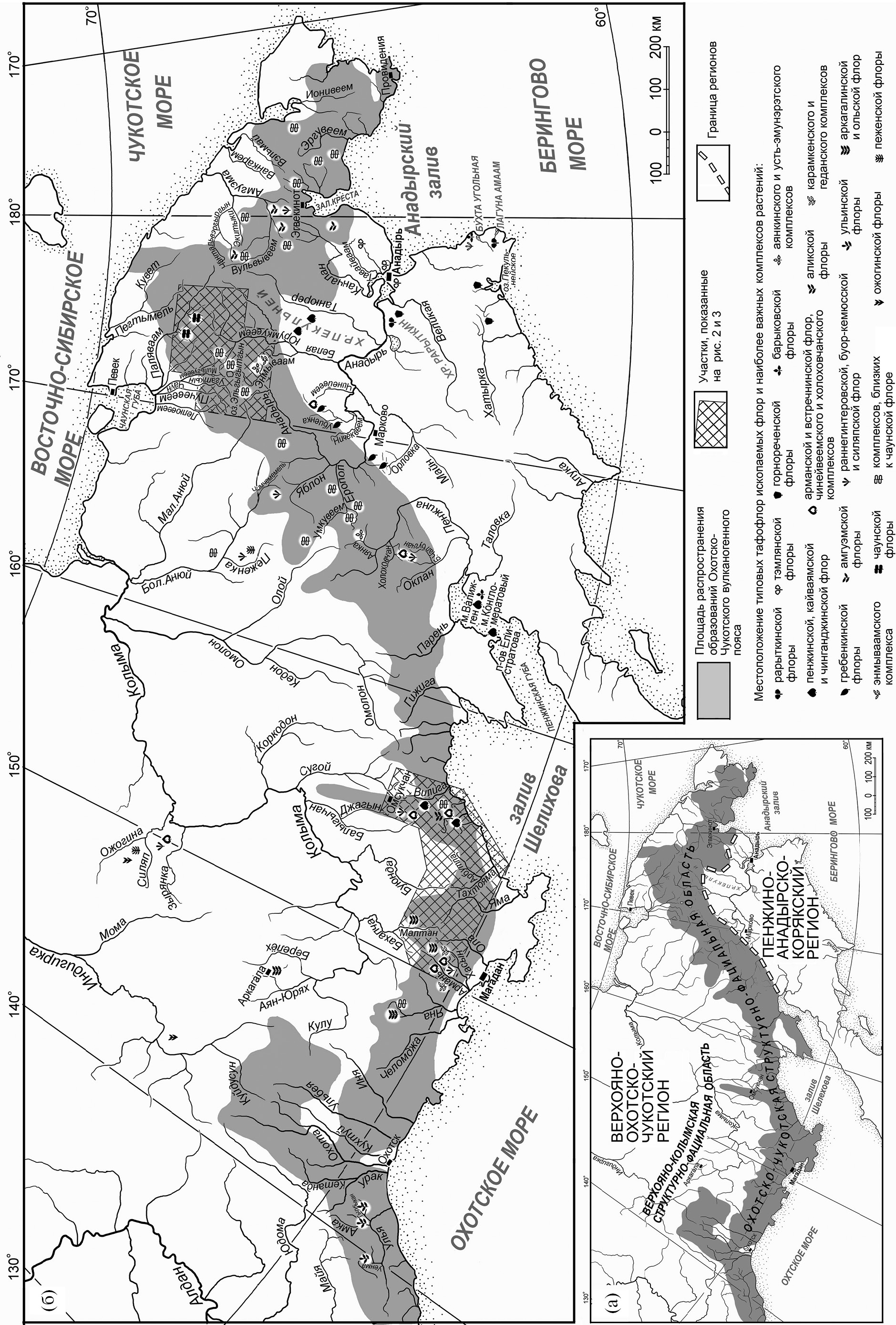 Рис. 1. (а) Районирование Северо-Востока России для мелового периода и (б) местонахождения основных тафофлор.