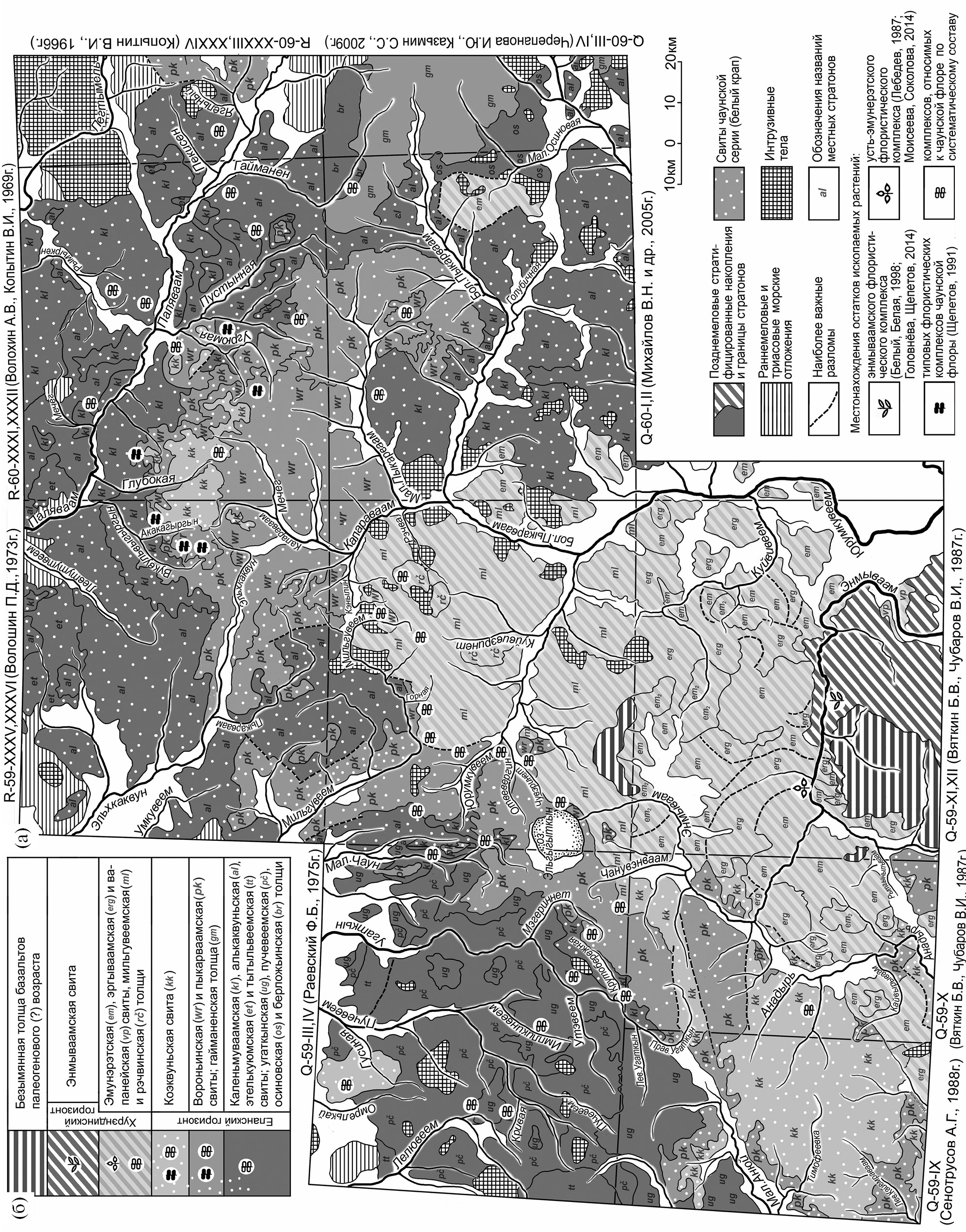 Рис. 2. (а) Схема геологического строения бассейнов рек Энмываам, Юрумкувеем, Паляваам, Угаткын (Центральная Чукотка) по материалам Государственных геологических карт масштаба 1:200 000 и (б) стратиграфическая последовательность позднемеловых вулканогенных накоплений данного района.
