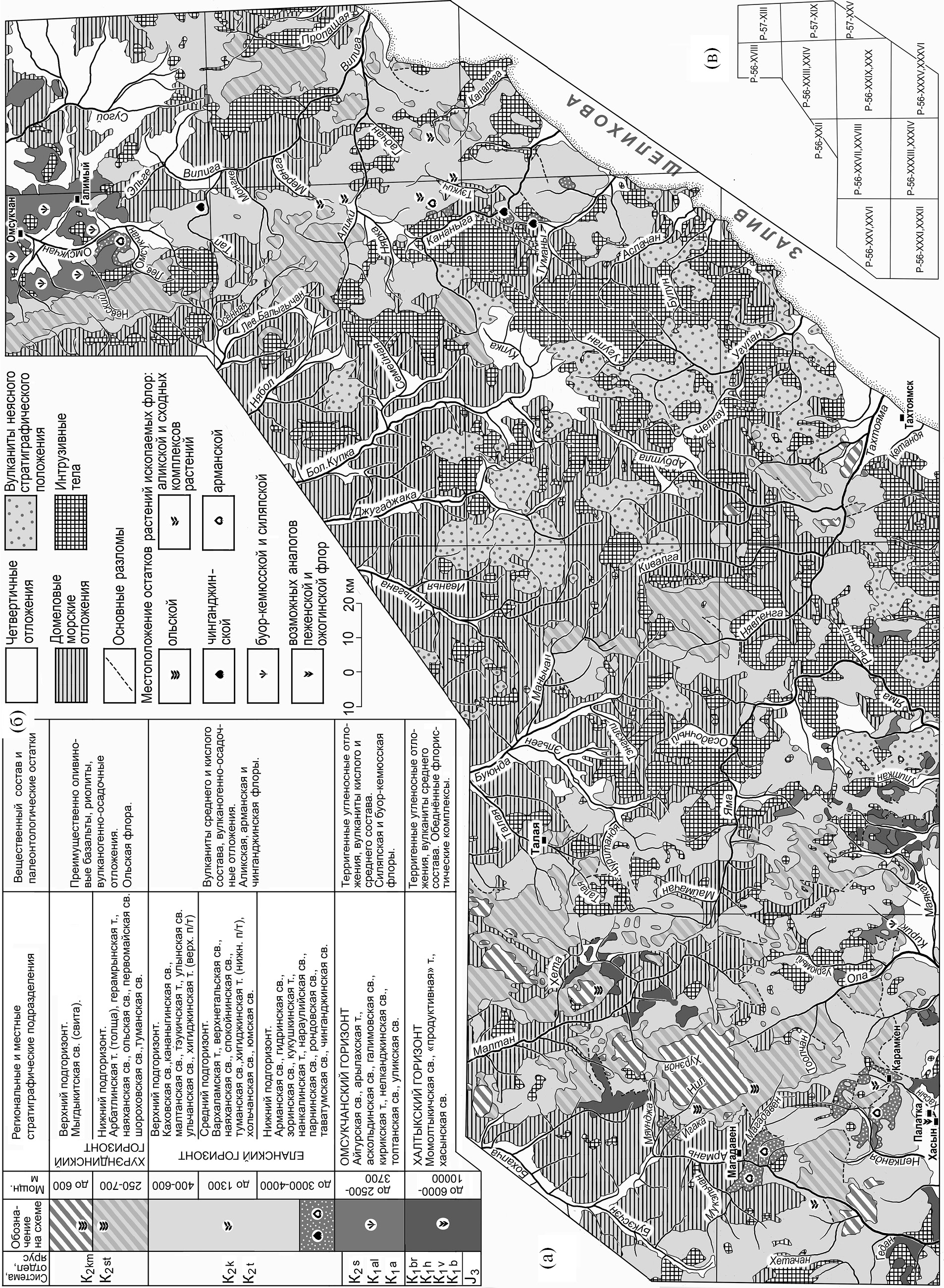 На Втором МРСС (Решения…, 1978) была принята единая последовательность горизонтов неморских отложений позднего мезозоя для всего Северо-Востока России. Дальнейшие исследования показали, что данное решение неверно – слишком сильно различается геологическая и биологическая история в разных частях этой территории. Третьим МРСС выделены Пенжино-Анадырско-Корякский и Верхояно-Охотско-Чукотский регионы, разделенные на структурно-фациальные области и зоны (рис. 1а).