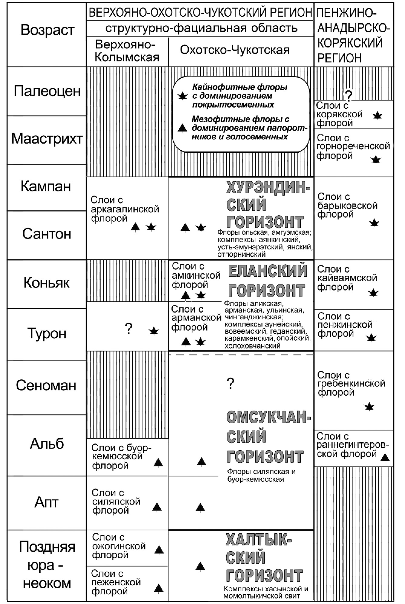 Авторы предлагают для обсуждения доработанный вариант стратиграфической схемы Охотско-Чукотской структурно-фациальной области, включающий халтыкский (верхи юры–неоком), омсукчанский (апт–низы турона), еланский (турон–коньяк) и хурэндинский (сантон–кампан) горизонты.