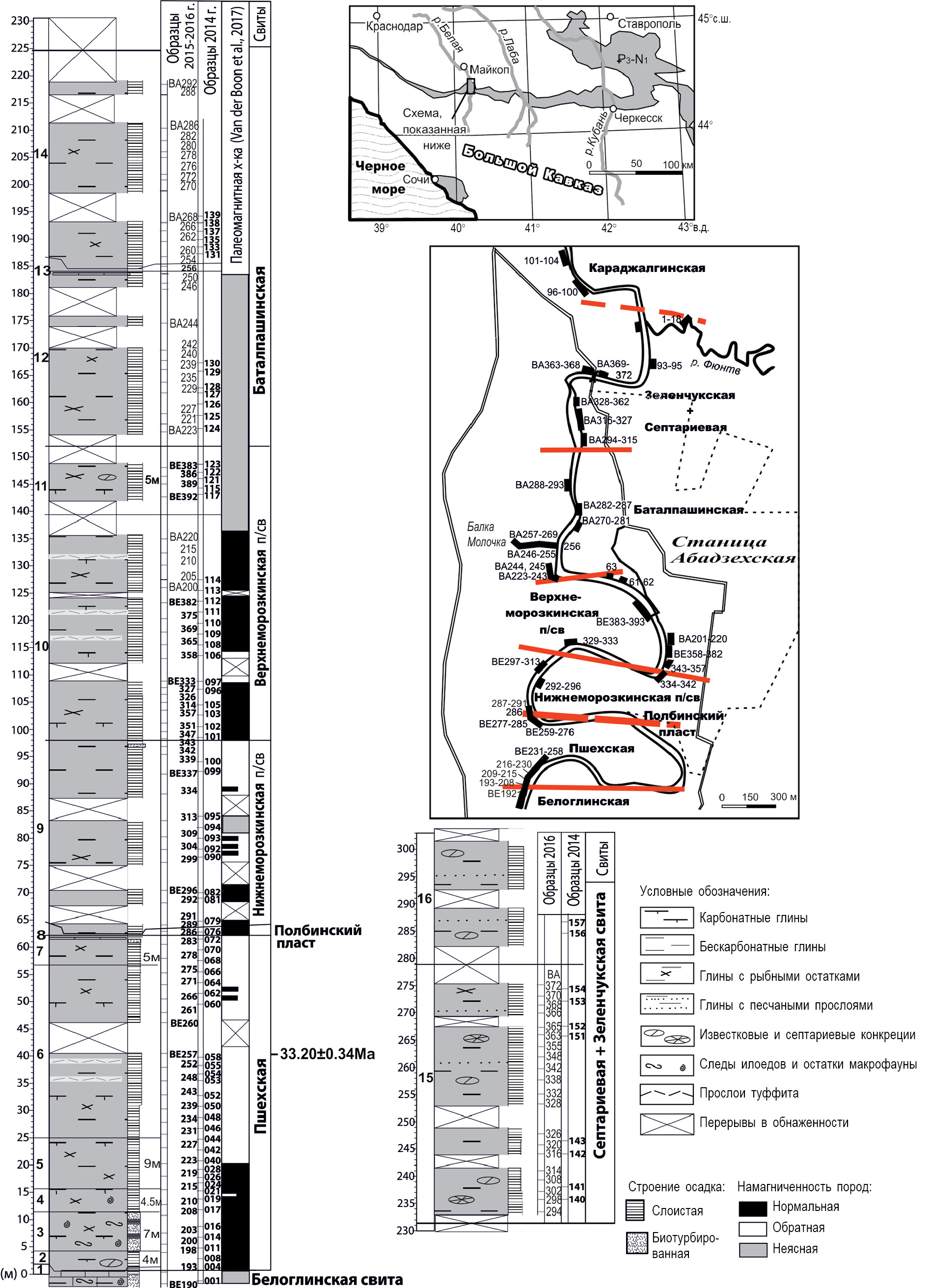 Обнажение майкопской части разреза начинается к югу от станицы Абадзехской, в 1.5 км ниже шоссейного и железнодорожного мостов, по левому берегу р. Белая (рис. 1) и непосредственно продолжает разрез эоценовых отложений (черкесской, керестинской, кумской и белоглинской свит; Попов и др., в печати).