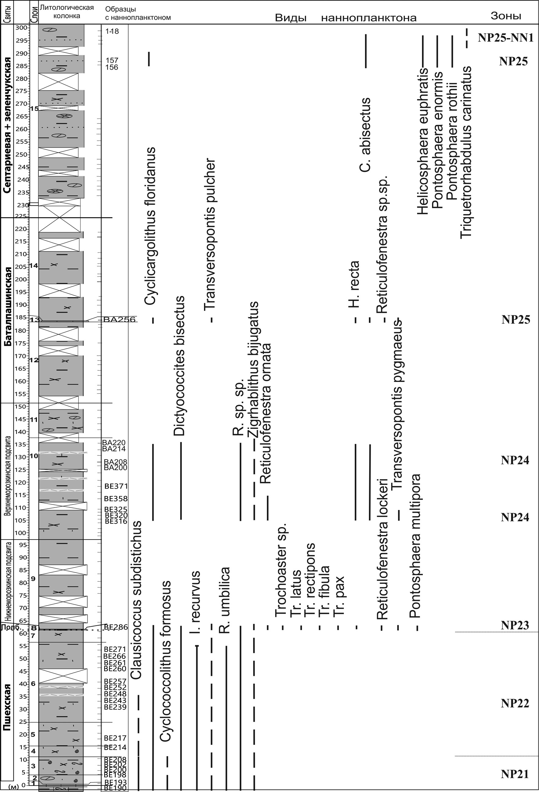 Пшехская свита. В основании пшехской свиты (слой 1, 2, обр. ВЕ193, 196) доминируют еще виды, унаследованные от эоцена (Coccolithus eopelagicus, Dictyococcites bisectus и Reticulofenestra umbilica), найдено по одному экземпляру Discoaster barbadiensis и D. saipanensis, исчезновением которых определяется верхняя граница зоны NP20 (или CP15 Discoaster barbadiensis). Однако на этом уровне наблюдается массовое переотложение микробиоты (Запорожец, 1999), поэтому одиночным находкам, вероятно, не следует придавать большое значение.