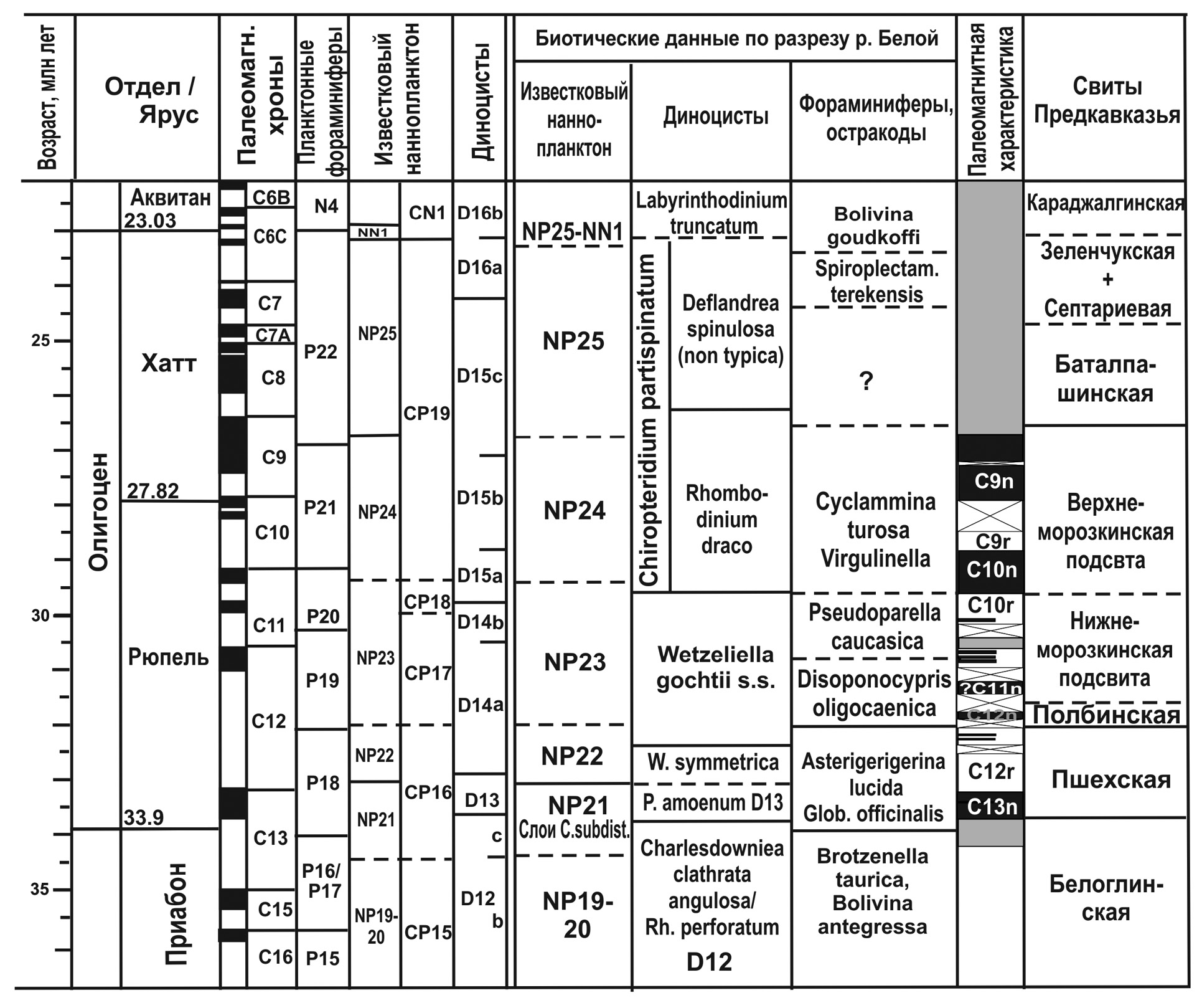 Рис. 5. Схема корреляции зонального деления разреза р. Белая с международной шкалой (по Gradstein et al., 2012; International…, 2017) по наннопланктону, диноцистам и палеомагнитным данным.