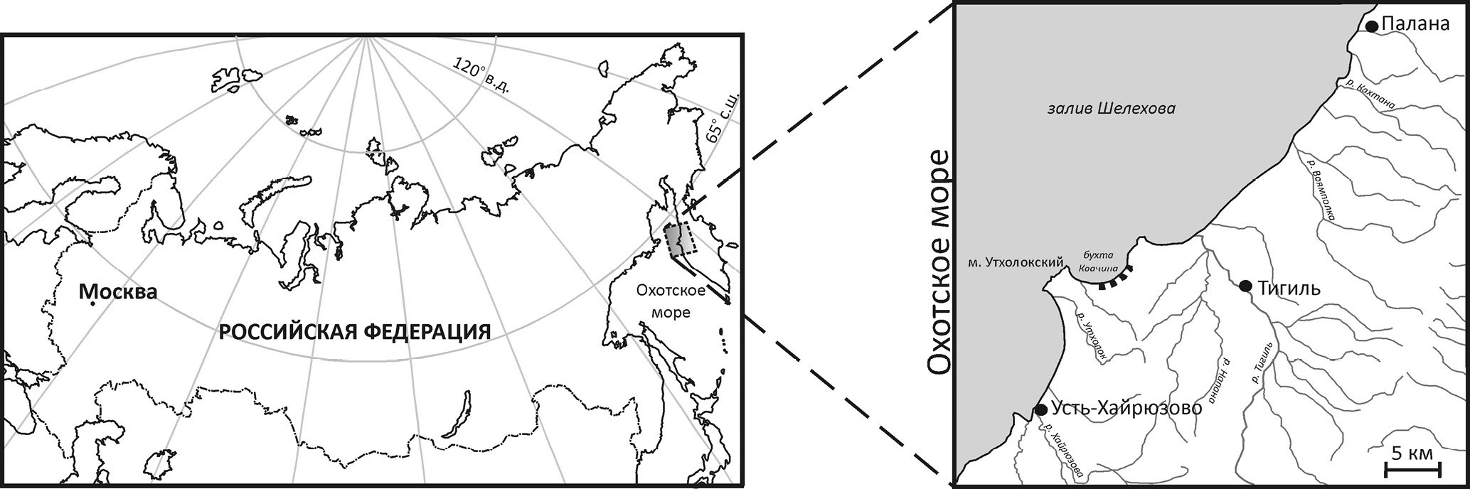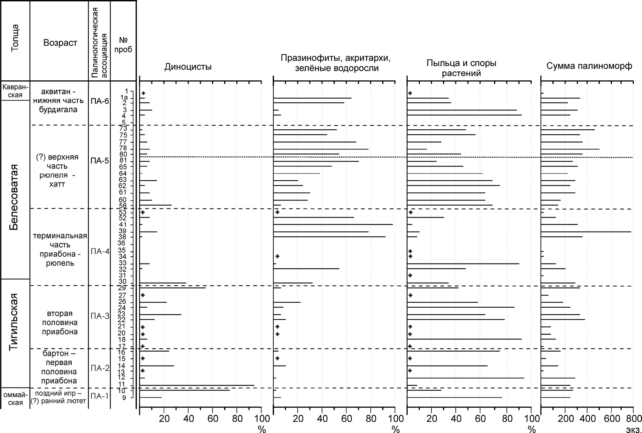 As a result of studying the stratigraphic distribution of palynomorphs in the Cenozoic marine strata of the Kvachina Bay section, six different age associations of dinocysts, spores, and pollen have been identified. Their analysis made it possible to date the deposits of the Tigil Unit by the Bartonian–Pribonian, the Belesovataya Unit – by the Oligocene–Early Miocene, and the overlying lower part of the Kavranian Series – by the Early Miocene. The age of the dislocated rocks underlying the Tigil Unit is estimated as Late Ypresian–(?) Early Lutetian. On the basis of the revealed changes in the ratios of the ecological groups of palynomorphs, conclusions were made about the paleoenvironmental in which the formation of strata took place in various time intervals.