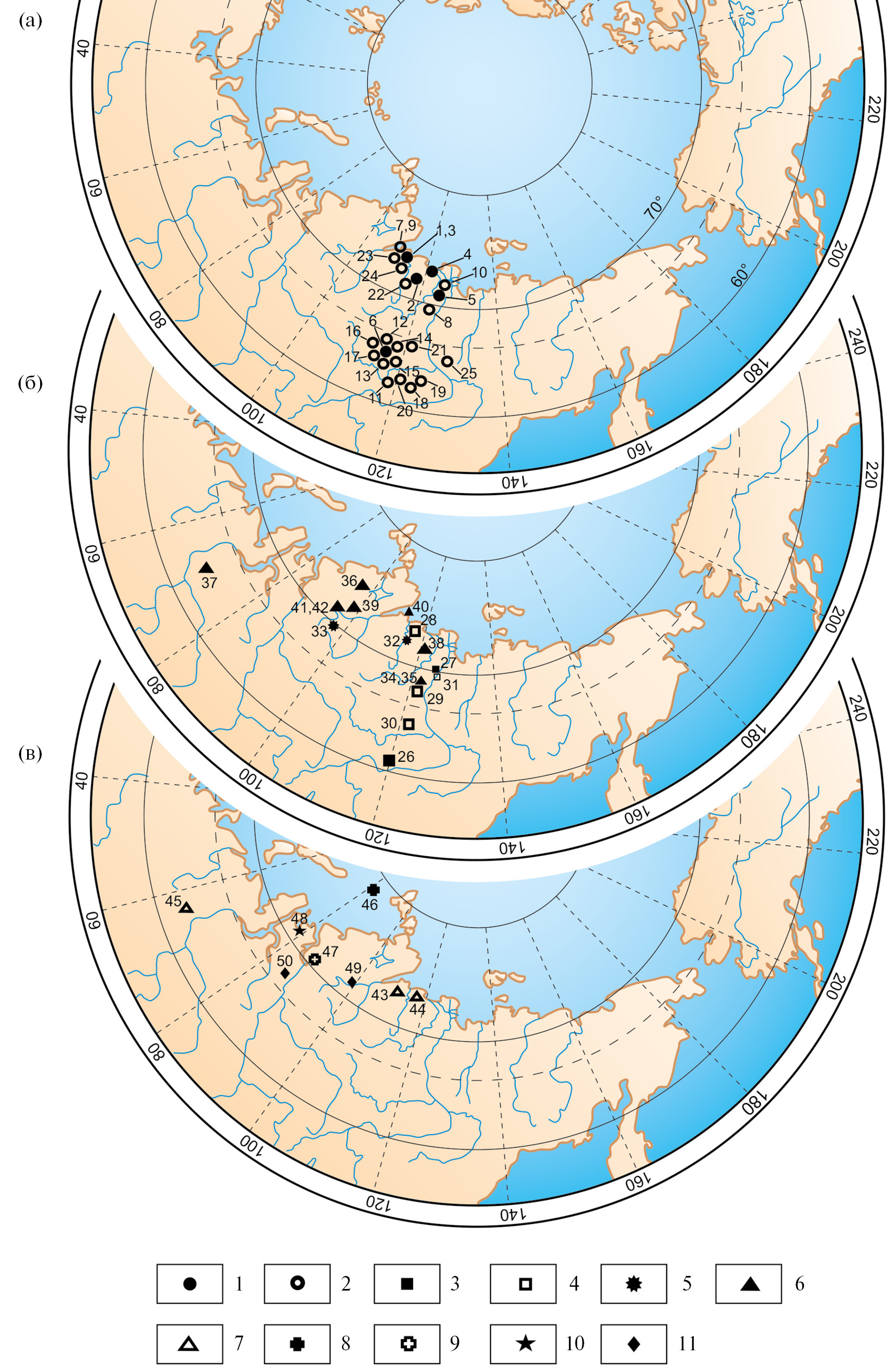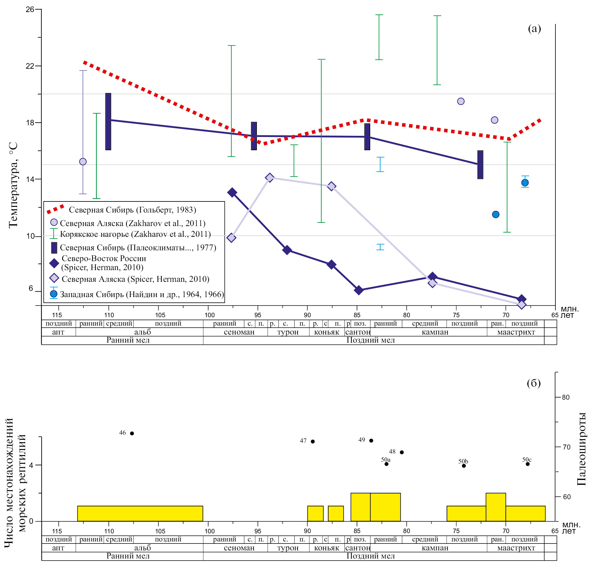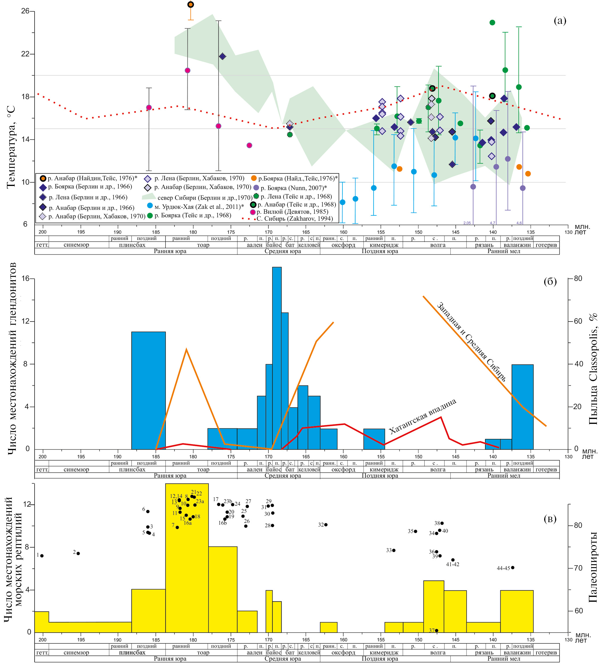На рис. 1а кружками показаны результаты определения палеотемператур по изотопному составу кислорода, ромбами – по соотношению Ca/Mg; звездочками отмечены те работы, где приводились исходные данные по изотопному составу ростров белемнитов, расчеты по которым были сделаны авторами по стандартной формуле для кальцита (модификация (Anderson, Arthur, 1983), со средним изотопным составом воды, характерным для безледникового климата (–1‰), см. табл. S1). Заливкой показан диапазон температур по соотношению Ca/Mg. Содержание пыльцы Classopollis дано по Вахрамееву (1980) с уточнениями по данным Ильиной (1985), Марковой, Скуратенко (1983) и Никитенко и др. (2015). Палеошироты, к которым приурочены находки костей морских рептилий (показаны точками на рис. 1в, номера соответствуют номерам на рис. 3 и в табл. 1), рассчитаны с помощью сайта paleolatitude.org.