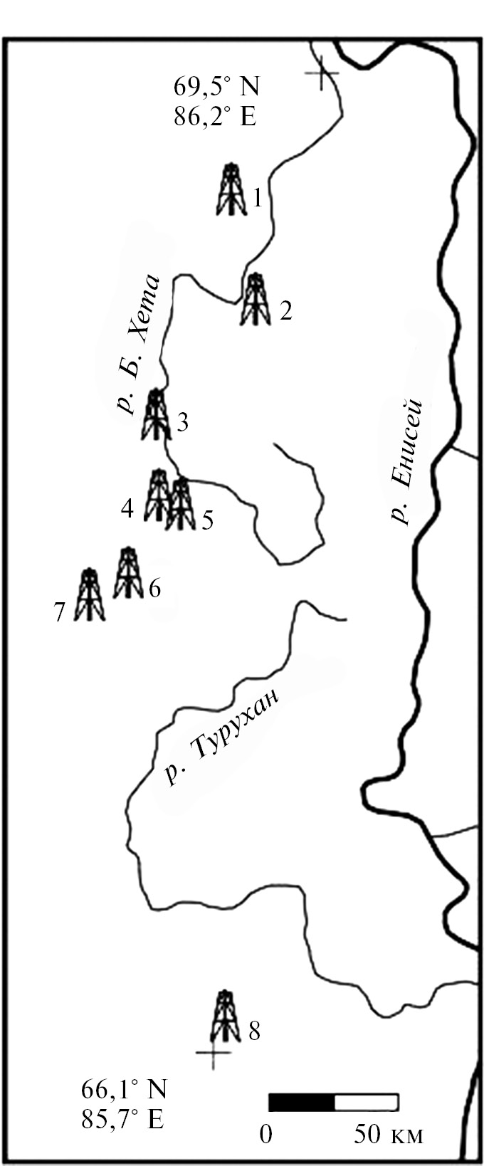 Буровые площади: 1 – Горчинская, 2 – Сузунская, 3 – Хикиглинская, 4 – Ванкорская, 5 – Восточно-Лодочная, 6 – Тагульская, 7 – Западно-Тагульская, 8 – Туруханская.
