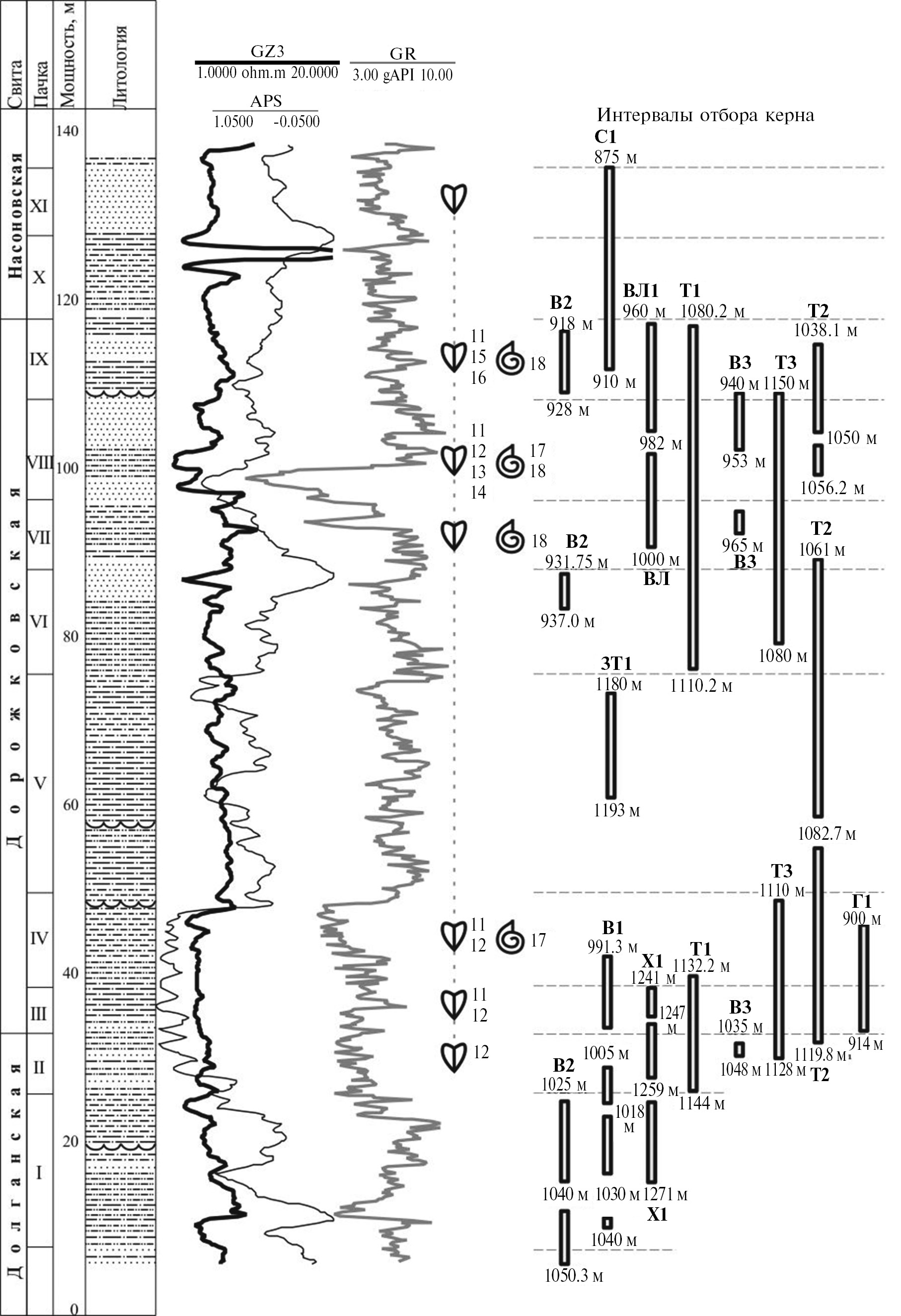 По данным комплексных био-литостратиграфических исследований керна, с использованием материалов ГИС и сейсмопрофилирования удалось построить сводный разрез дорожковской свиты, состоящий из 11 пачек (рис. 2). Для каждой пачки установлен специфический набор литологических, структурных и палеонтологических признаков.