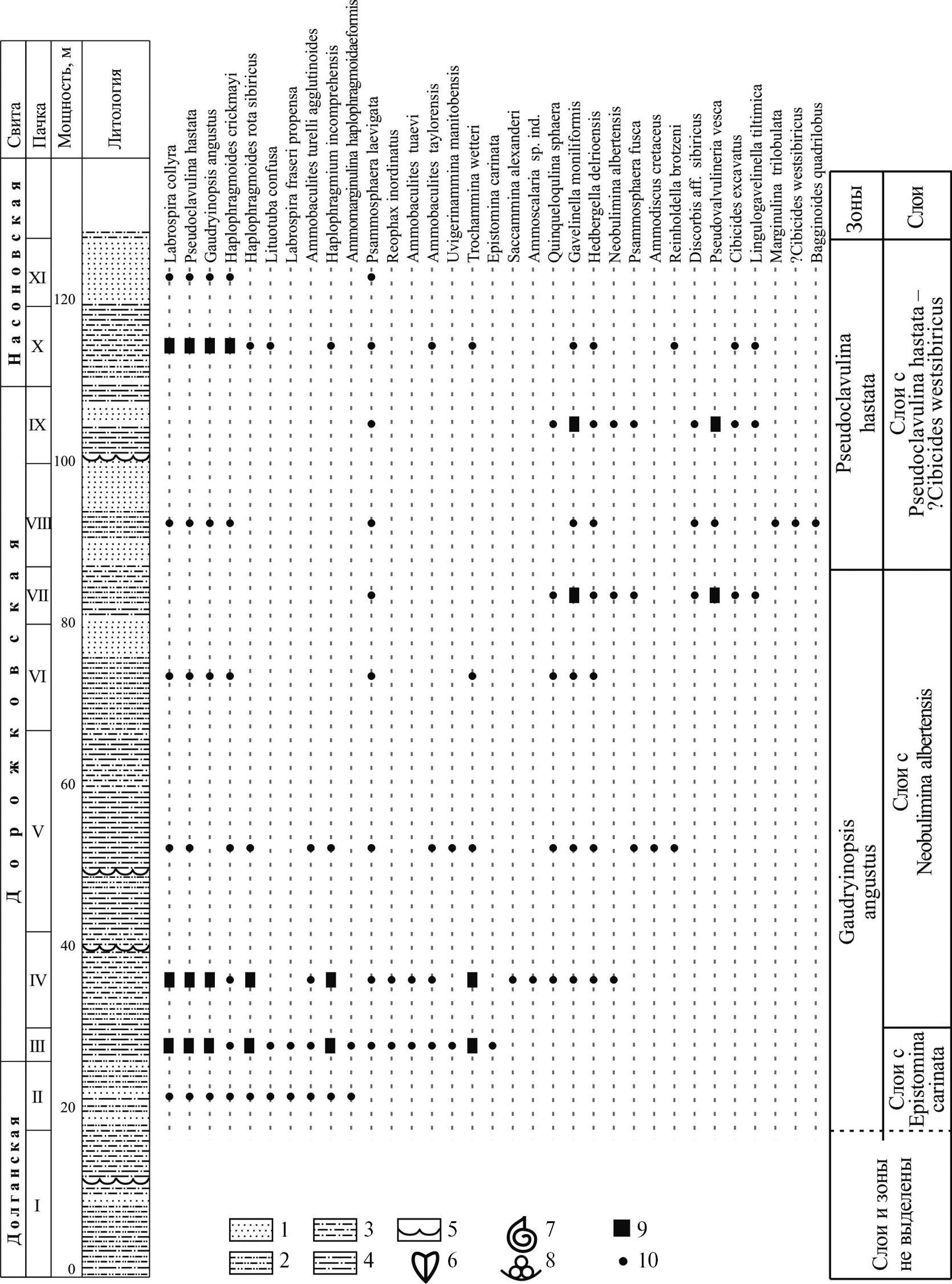 Рис. 3. Распределение фораминифер в разрезе дорожковской и насоновской свит Большехетской структурной террасы.