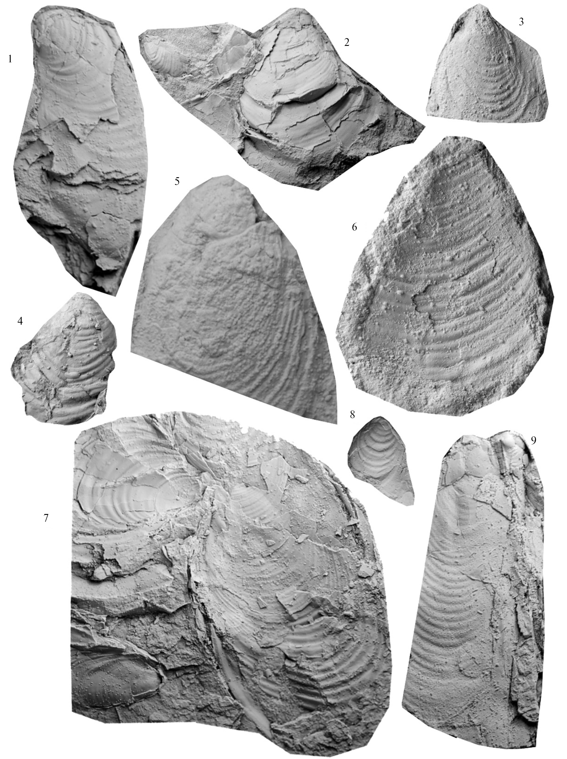 1, 5, 7–9 – Mytiloides labiatus (Schloth.): 1 – экз. № 2086/1, вид со стороны левой створки, скв. Тагульская 2, глубина 1112.2 м, пачка III; 5 – экз. № 2086/2, вид со стороны правой створки, скв. Тагульская 2, гл. 1110.9 м, пачка IV; 7 – экз. № 2086/3, вид со стороны правой створки, скв. Тагульская 2, гл. 1114.2 м, пачка III; 8 – экз. № 2086/4, вид со стороны левой створки, скв. Тагульская 2, гл. 1099.1 м, пачка IV; 9 – экз. № 2086/5, вид со стороны левой створки, скв. Тагульская 2, гл. 1112.4 м, пачка III; 2 – Mytiloides cf. labiatus (Schloth.) (слева мелкий фрагмент), вид со стороны правой створки, Mytiloides cf. hercynicus (Petr.) (справа крупная раковина), вид со стороны правой створки, экз. № 2086/7; скв. Тагульская 2, гл. 1045.5 м, пачка VIII; 3 – Mytiloides cf. labiatus (Schloth.), экз. № 2086/6, вид со стороны левой створки, скв. Тагульская 1, гл. 1135.1 м, пачка IV; 4 – Inoceramus cf. lamarcki Parkinson, экз. № 2086/8, вид со стороны правой створки, скв. Восточно-Лодочная, гл. 961.2 м, пачка IX; 6 – Inoceramus ex gr. lamarcki Parkinson, экз. № 2086/9, фрагмент левой створки, скв. Сузунская, гл. 908.0 м, пачка IX.