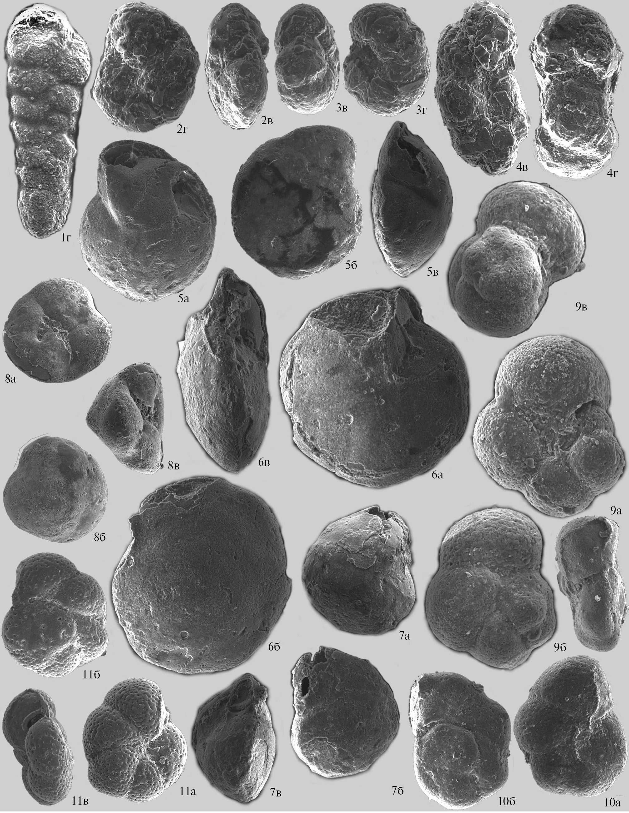1 – Gaudryinopsis angustus Podobina, экз. № 1074/921 (×100), скв. Тагульская 2, обр. Т-25-12, интервал 1098–1103 м, 3.7 м от верха керна, пачка IV, дорожковская свита, нижний турон; 2, 3 – Haplophragmoides rota sibiricus Zaspelova: 2 – экз. № 1074/926 (×100), 3 – экз. № 1074/925 (×100); скв. Тагульская 2, обр. Т-25-12, инт. 1098–1103 м, 3.7 м от верха керна, пачка IV, дорожковская свита, нижний турон; 4 – Labrospira collyra (Nauss), экз. № 1074/923 (×100), скв. Тагульская 2, обр. Т-25-12, инт. 1098–1103 м, 3.7 м от верха керна, пачка IV, дорожковская свита, нижний турон; 5–7 – Epistomina carinata (N. Bykova): 5 – экз. № 1074/916 (×100), 6 – экз. № 1074/919 (×100), 7 – экз. № 1074/917 (×100); скв. Тагульская 2, обр. Т-25-12, инт. 1098–1103 м, 3.7 м от верха керна, пачка IV, дорожковская свита, нижний турон; 8 – Reinholdella brotzeni Olsson, экз. № 1074/915 (×100), скв. Сузунская, обр. С-34-11, гл. 887 м, пачка X, насоновская свита, средний турон; 9 – Hedbergella delrioensis (Carsey), экз. № 1074/933 (×200), скв. Тагульская 2, обр. Т-25-12, инт. 1098–1103 м, 3.7 м от верха керна, пачка IV, дорожковская свита, нижний турон; 10 – Cibicides xcavates Brotzen, экз. № 1074/928 (×100), скв. Восточно-Лодочная, обр. Вл-1-14, инт. 992–1000 м, 2 м от верха керна, пачка VII, дорожковская свита, нижний турон; 11 – (?)Cibicides westsibiricus (Balakhm.), экз. № 1074/927 (×100), скв. Тагульская 2, обр. Т-25-31, инт. 1050.0–1056.2 м, 2.7 м от верха керна, пачка VIII, дорожковская свита, средний турон.