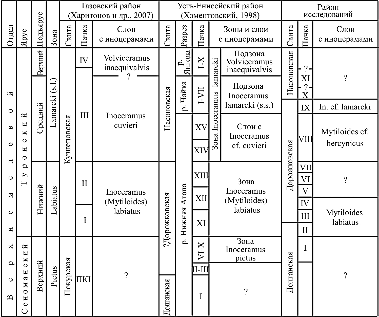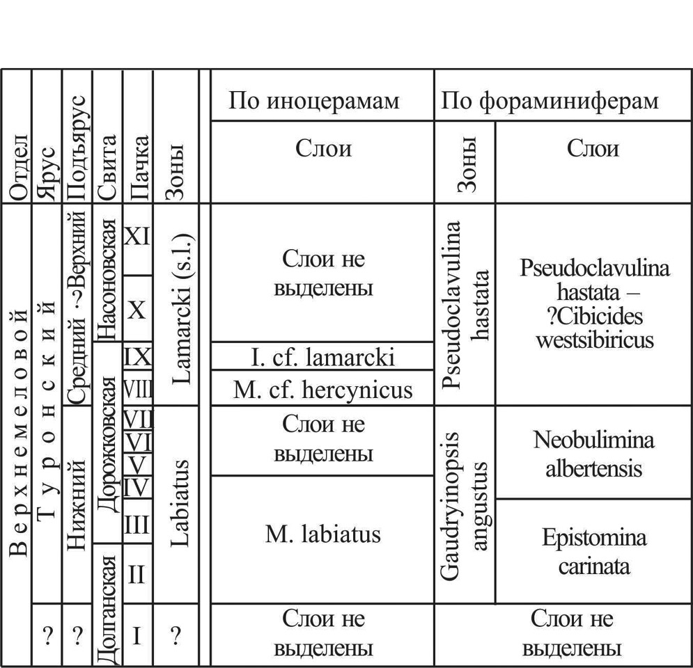 Корреляция. Слои соответствуют нижней части зоны Inoceramus labiatus нижнего турона Сибири.