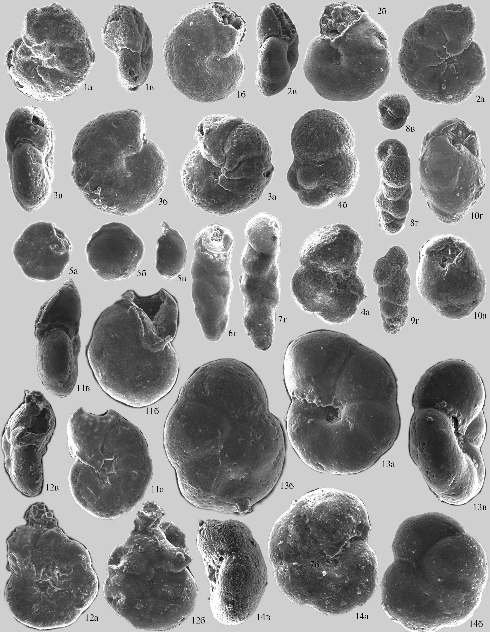 1 – Lingulogavelinella tiltimica (Marinov), экз. № 1074/906 (×150), скв. Тагульская 2, обр. Т-25-12, инт. 1098–1103 м, 3.7 м отверха керна, пачка IV, дорожковская свита, нижний турон; 2 – Lingulogavelinella tiltimica (Marinov), экз. № 1074/903 (×150), скв. Сузунская, обр. С-34-6, гл. 902.7 м, пачка IX, дорожковская свита, средний турон; 3 – Lingulogavelinella tiltimica (Marinov), экз. № 1074/907 (×150); скв. Тагульская 2, обр. Т-25-12, инт. 1098–1103 м, 3.7 м отверха керна, пачка IV, дорожковская свита, нижний турон; 4 – Bagginoides quadrilobus (Mello), экз. № 1074/914 (×150), скв. Сузунская, обр. С-34-6, гл. 902.7 м, пачка IX, дорожковская свита, средний турон; 5 – Discorbis aff. sibiricus Dain, экз. № 1074/914 (×150), скв. Восточно-Лодочная, обр. Вл-1-14, инт. 992–1000 м, 2 м отверха керна, пачка VII, дорожковская свита, нижний турон; 6, 7 – Neobulimina albertensis (Stelck et Wall): 6 – экз. № 1074/909 (×150), 7 – экз. № 1074/908; скв. Тагульская 2, обр. Т-25-12, инт. 1098–1103 м, 3.7 м от верха керна, пачка IV, дорожковская свита, нижний турон; 8, 9 – Neobulimina albertensis (Stelck et Wall): 8 – экз. № 1074/910 (×150), 9 – экз. № 1074/911; скв. Тагульская 2, обр. Т-25-12, инт. 1098–1103 м, 3.7 м от верха керна, пачка IV, дорожковская свита, нижнийтурон; 10 – Praebulimina venusae (Nauss), экз. № 1074/912 (×150), скв. Сузунская, обр. С-34-6, гл. 902.7 м, пачка IX, дорожковская свита, средний турон; 11, 12 – Pseudovalvulineria vesca (N. Bykova): 11 – экз. № 1074/928 (×200), 12 – экз. № 1074/930 (×200); скв. Восточно-Лодочная, обр. Вл-1-14, инт. 992–1000 м, 2 м от верха керна, пачка VII, дорожковская свита, нижний турон; 13, 14 – Gavelinella moniliformis (Reuss): 13 – экз. № 1074/931 (×200), 14 – экз. № 1074/932 (×200); скв. Восточно-Лодочная, обр. Вл-1-14, инт. 992–1000 м, 2.0 м от верха керна, пачка VII, дорожковская свита, нижний турон.
