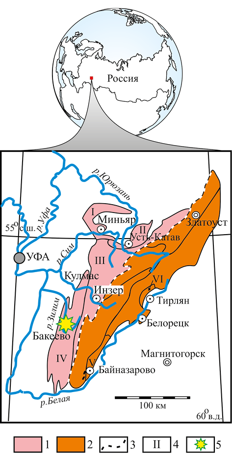 Рис. 1. Схема строения Башкирского антиклинория и положение изученного разреза бакеевской свиты из открытых обнажений и в скважине № 23, пробуренной на р. Зилим вблизи д. Бакеево. 1 – внешняя фациальная зона, 2 – внутренняя фациальная зона, 3 – граница между внешней и внутренней зонами, 4 – структурные единицы зон, 5 – положение изученного разреза. Структурные единицы: I – Каратауская антиклиналь, II – Сулеймановская антиклиналь, III – Инзерский синклинорий, IV – Алатауский ¬антиклинорий, V – Бельская впадина, VI – Тирлянская мульда.