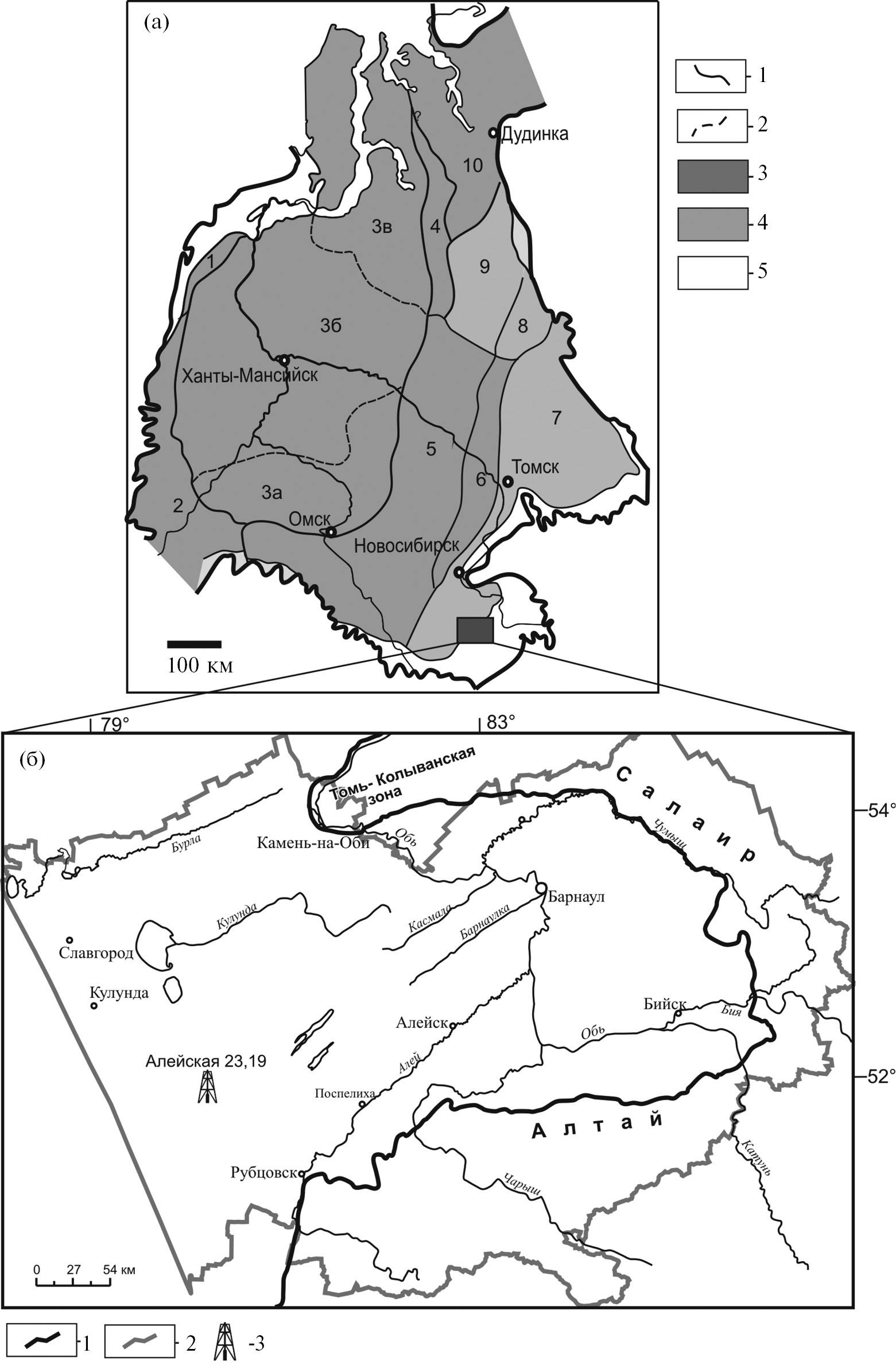 (б): 1 – граница Западной Сибири; 2 – административная граница Алтайского края; 3 – местоположение скважин.