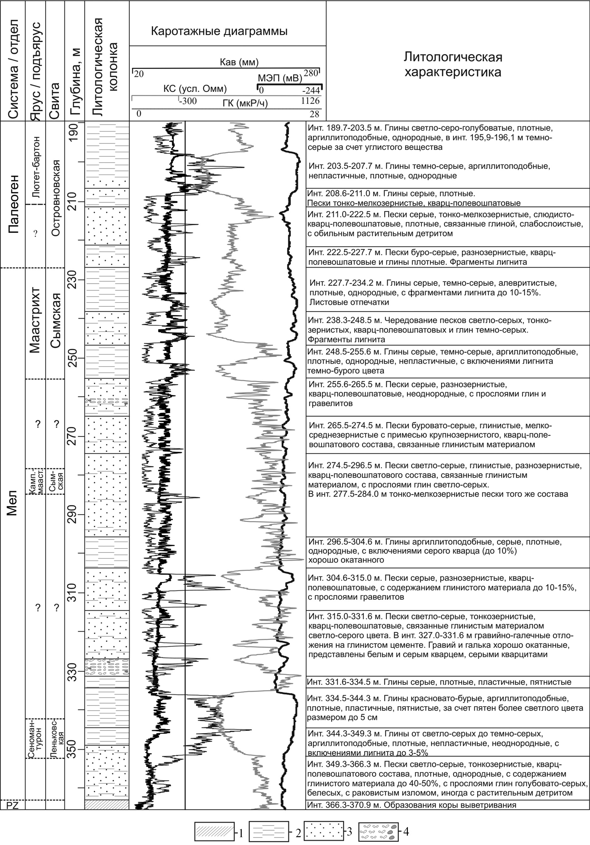 1 – кора выветривания по палеозойским породам; 2 – глины; 3 – пески; 4 – гравелиты. Сокращения: Камп.-мааст. – Кампан–маастрихт.