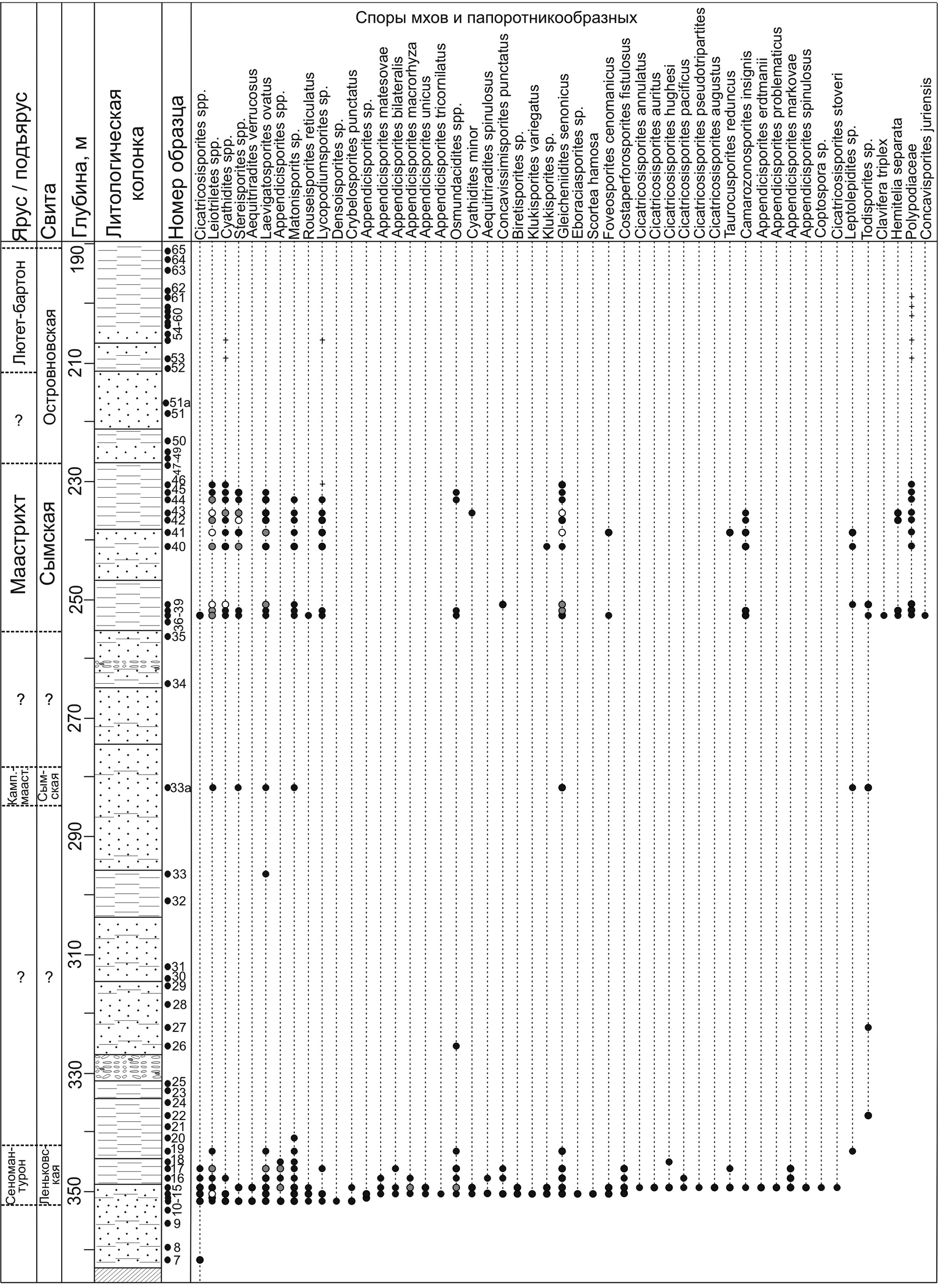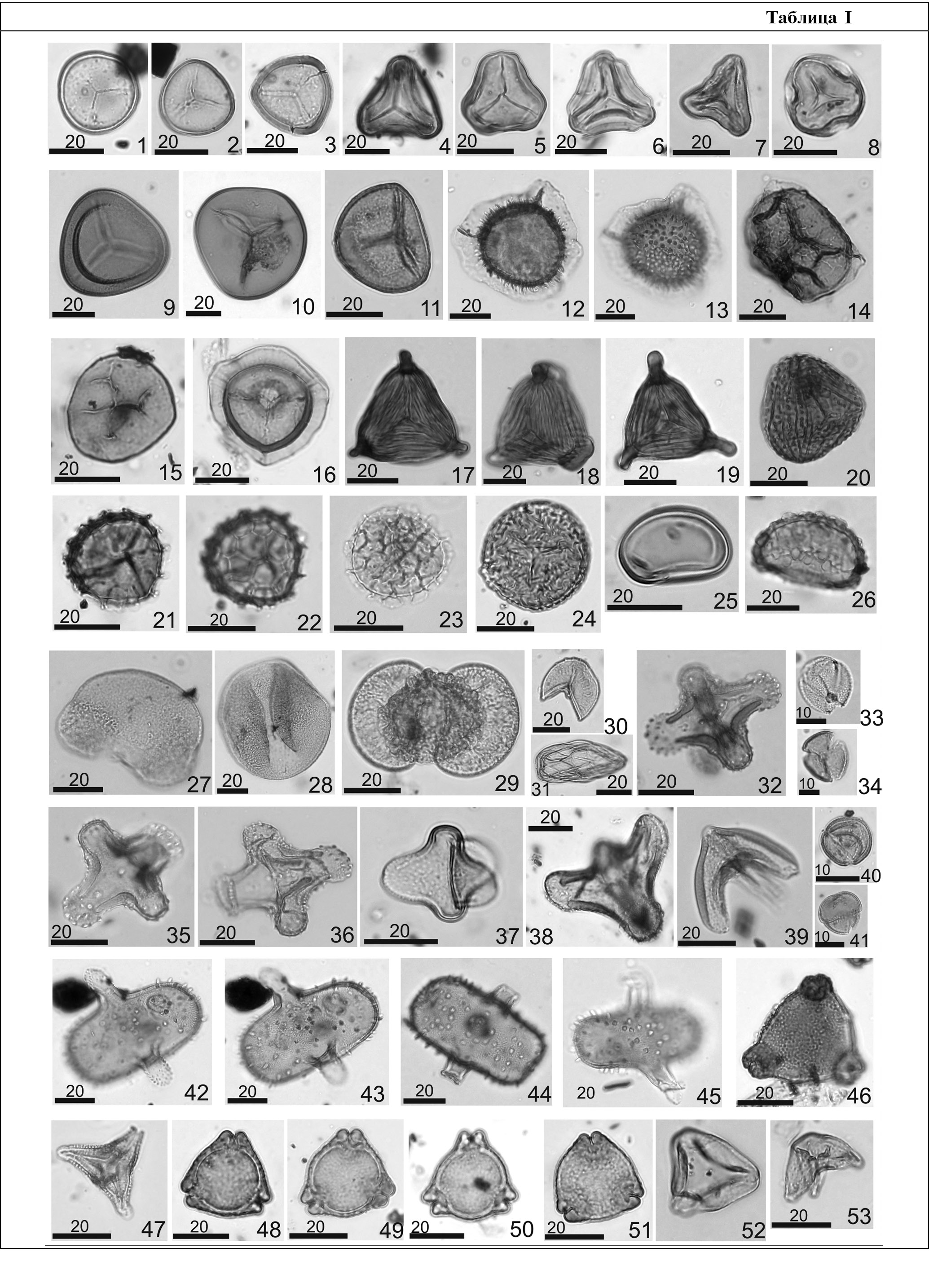 1 – Stereisporites psilatus (Ross) Pflug, гл. 241.3 м, обр. 40; 2 – Stereisporites antiquasporites (Wilson et Webster) Dettmann, гл. 237.1 м, обр. 42; 3 – Cingutriletes clavus (Balme) Dettmann, гл. 237.1 м, обр. 42; 4 – Gleicheniidites cirniidites (Cookson) Dettmann, гл. 237.1 м, обр. 42; 5 – Gleicheniidites senonicus Ross, гл. 236.7 м, обр. 43; 6 – Gleicheniidites radiatus (Bolchovitina) Bolchovitina, гл. 237.1 м, обр. 42; 7 – Plicifera delicata (Bolchovitina) Bolchovitina, гл. 241.3 м, обр. 40; 8 – Hemitelia separata Chlonova, гл. 236.7 м, обр. 43; 9 – Biretisporites sp., гл. 349.8 м, обр. 15; 10 – Cyathidites sp., гл. 349.8, обр. 15; 11 – Concavissimisporites punctatus (Delcourt et Sprumont) Brenner, гл. 241.3 м, обр. 40; 12, 13 – Aequitriradites spinulosus (Cookson et Dettmann) Cookson et Dettmann, гл. 350.6 м, обр. 14; 14 – Rouseisporites reticulatus Pocock, гл. 350.6 м, обр. 14; 15 – Rouseisporites laevigatus Pocock, гл. 253.4 м, обр. 38; 16 – Staplinisporites sp., гл. 237.1 м, обр. 42; 17 – Appendicisporites macrorhyzus (Maljavkina) Bondarenko, гл. 350.6 м, обр. 14; 18 – Appendicisporites matesovae (Bolchovitina) Norris, гл. 349.8, обр. 15; 19 – Appendicisporites unicus (Markova) Singh, гл. 350.6, обр. 14; 20 – Cicatricosisporites perforatus (Markova) Döring, гл. 349.8 м, обр. 15; 21, 22 – Lycopodiumsporites marginatus Singh, гл. 237.1 м, обр. 42; 23 – Lycopodiumsporites clavatoides Couper, гл. 253.4 м, обр. 37; 24 – Camarozonosporites insignis Norris, гл. 241.3 м, обр. 40; 25 – Laevigatosporites ovatus Wilson et Webster, гл. 241.3 м, обр. 40; 26 – Polypodiaceae, гл. 253.4 м, обр. 37; 27 – Cedripites parvisaccatus (Sauer) Chlonova, гл. 349.8 м, обр. 15; 28 – Phyllocladidites inchoatus (Pierce) Norris, гл. 349.8 м, обр. 15; 29 – Cedripites sp., гл. 241.3 м, обр. 40; 30 – Taxodiaceaepollenites hiatus (Pot.) Kremp., гл. 237.1 м, обр. 42; 31 – Ephedripites costatus Bolchovitina, гл. 241.3 м, обр. 40; 32 – Aquilapollenites granulatus N. Mtchedlishvili, гл. 253.4 м, обр. 37; 33 – Menispermum turonicum N. Mtchedlishvili, гл. 349.8 м, обр. 15; 34 – Tricolpites sp., гл. 253.4 м, обр. 37; 35 – Aquilapollenites unicus (Chlonova) Chlonova, гл. 253.4 м, обр. 37; 36 – Aquilapollenites cruciformis N. Mtchedlishvili, гл. 253.4 м, обр. 38; 37 – Aquilapollenites subtilis N. Mtchedlishvili, гл. 241.3 м, обр. 40; 38 – Mancicorpus senonicum N. Mtchedlishvili, гл. 253.4 м, обр. 38; 39 – Mancicorpus anchoriforme N. Mtchedlishvili, гл. 253.4 м, обр. 37; 40, 41 – Tricolpites sagax Norris, 40 – гл. 253.4 м, обр. 38, 41 – гл. 253.4 м, обр. 37; 42, 43 – Projectoporites unicus N. Mtchedlishvili, гл. 253.4 м, обр. 37; 44 – Projectoporites ovalis N. Mtchedlishvili, гл. 253.4 м, обр. 37; 45 – Projectoporites magnus N. Mtchedlishvili, гл. 253.4 м, обр. 37; 46 – Proteacidites tumidiporis Samoilovitch, гл. 236.7 м, обр. 43; 47 – Cranwellia striata (Couper) Srivastava, гл. 253.4 м, обр. 38; 48 – Trudopollis protrudens Pflug, гл. 241.3 м, обр. 40; 49 – Trudopollis bulbosus Zaklinskaja, гл. 237.1 м, обр. 42; 50 – Trudopollis ordinatus Zaklinskaja, гл. 237.1 м, обр. 42; 51 – Ocullopollis sp., гл. 236.7 м, обр. 43; 52 – Kuprianipollis sp., гл. 253.4 м, обр. 37; 53 – Tricerapollis minimus Chlonova, гл. 253.4 м, обр. 38.