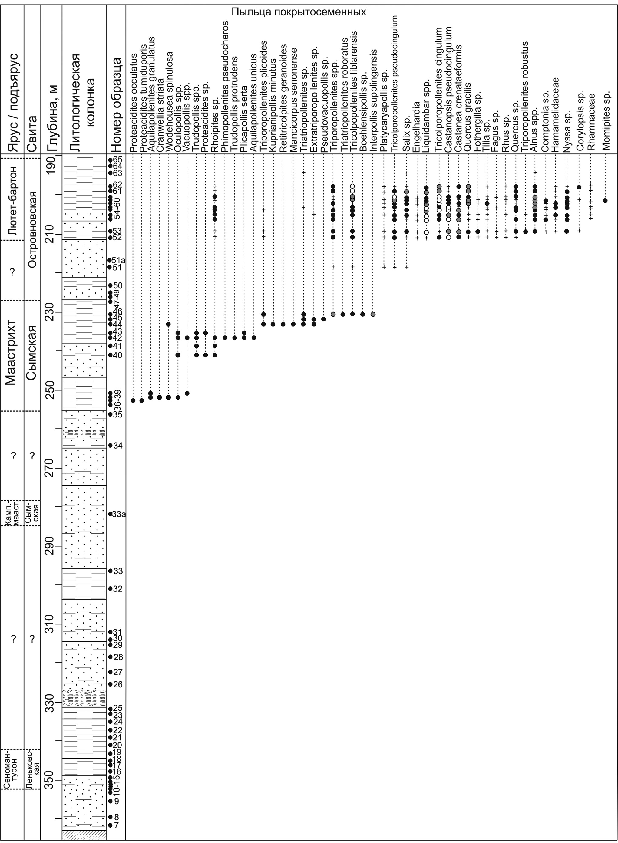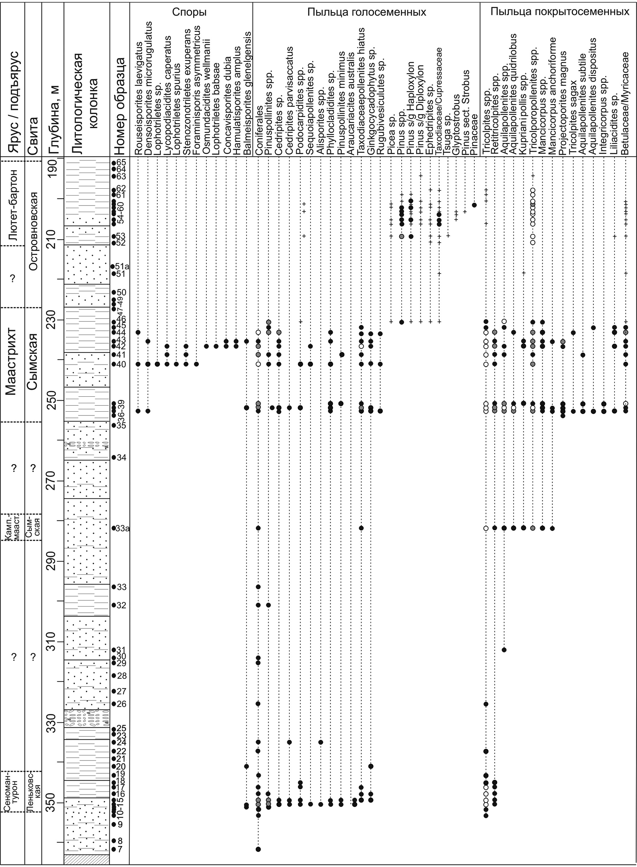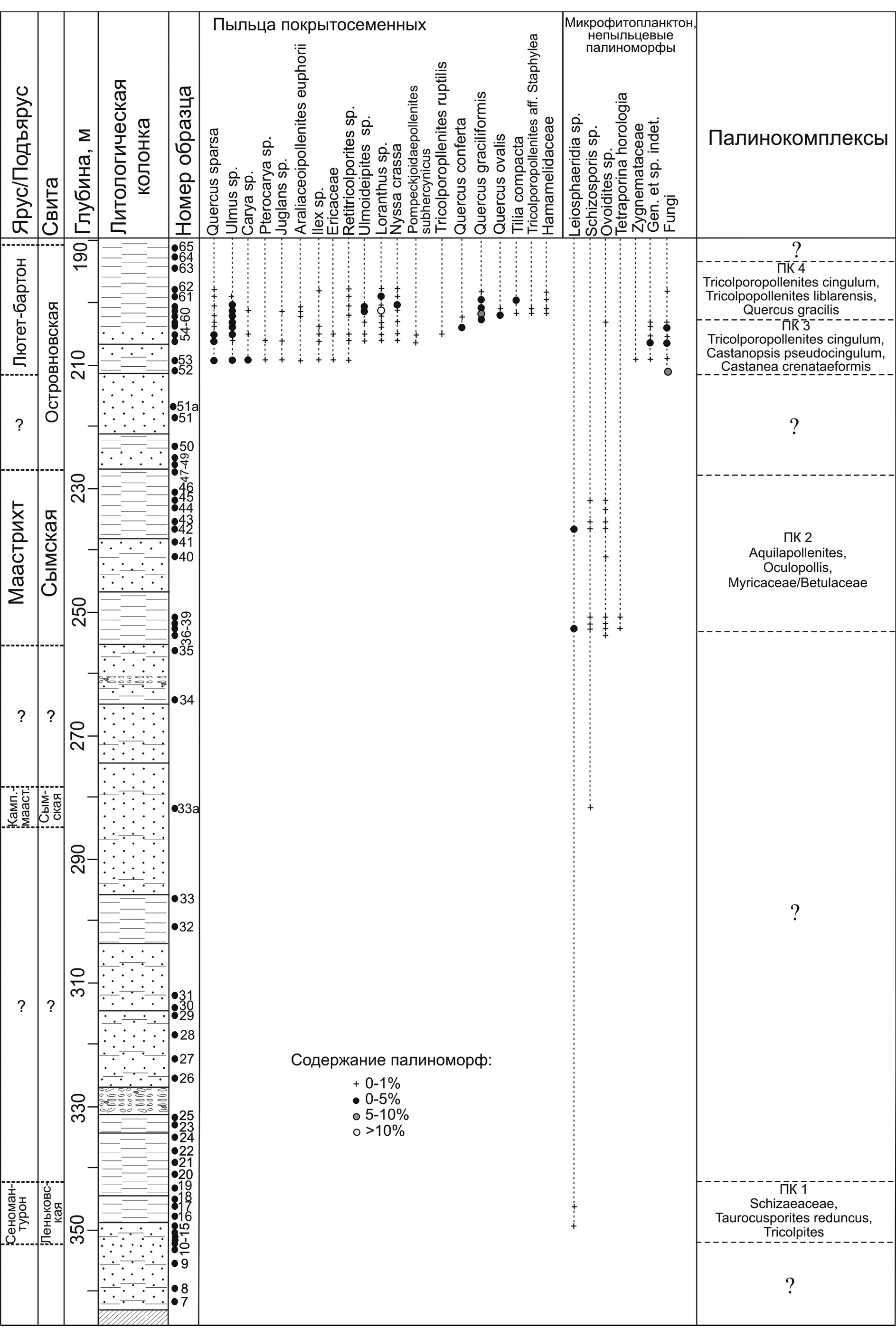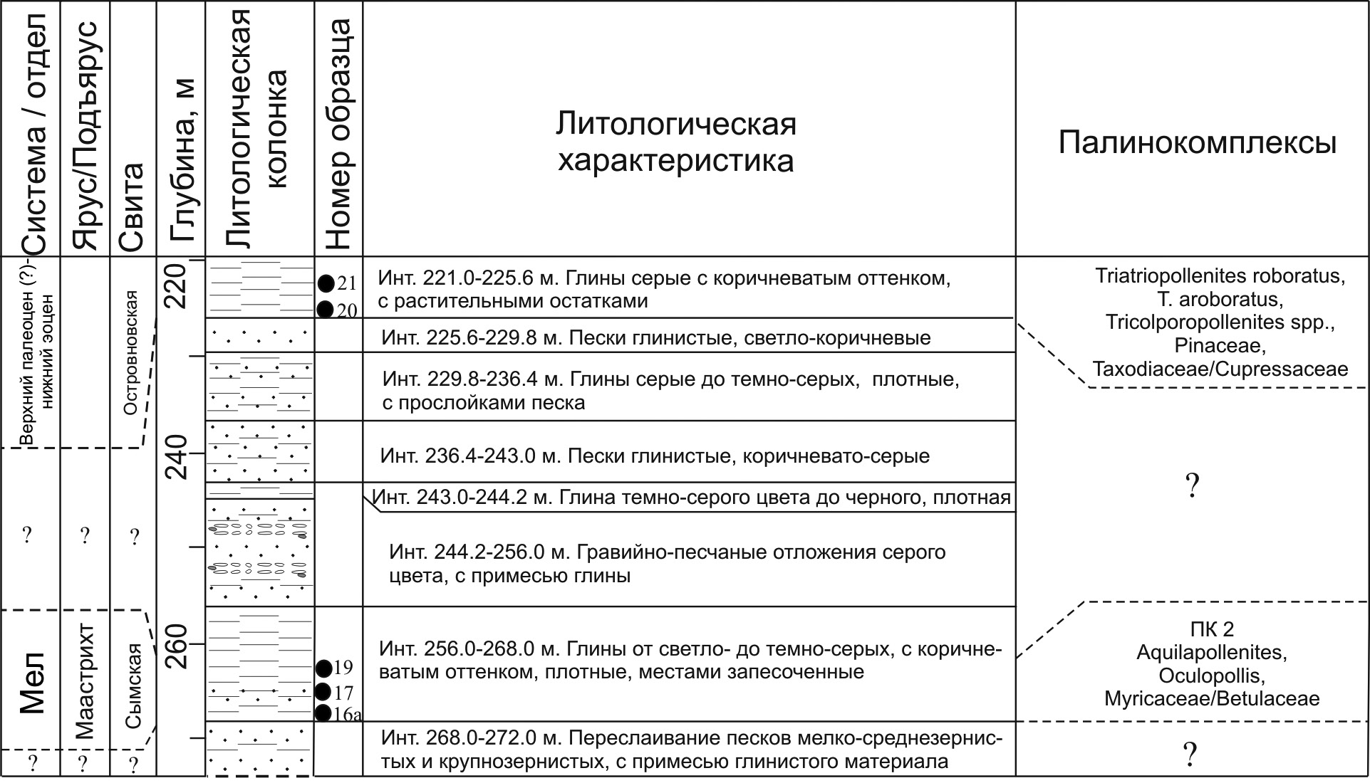 На глубине 227.7 м глины верхнесымской подсвиты сменяются песками буровато-серыми, с включением лигнита (рис. 2), которые практически не содержат спор и пыльцы (инт. 227.5–210.4 м, обр. 47, 48, 51, 51а). Только в образцах 48 (гл. 227 м), 51 (гл. 219.3 м), 51а (гл. 216.1 м) обнаружены единичные пыльцевые зерна, принадлежащие Triatriopollenites roboratus, Triporopollenites plicoides, Triporopollenites sp., Tricolpites sp., Tricolporopollenites pseudocingulum (Potonie) Thomson et Pflug, Tricolpopollenites liblarensis, Picea sp., Taxodiaceae/Cupressaceae. Эти пески, предположительно, относятся к островновской свите палеогенового возраста.