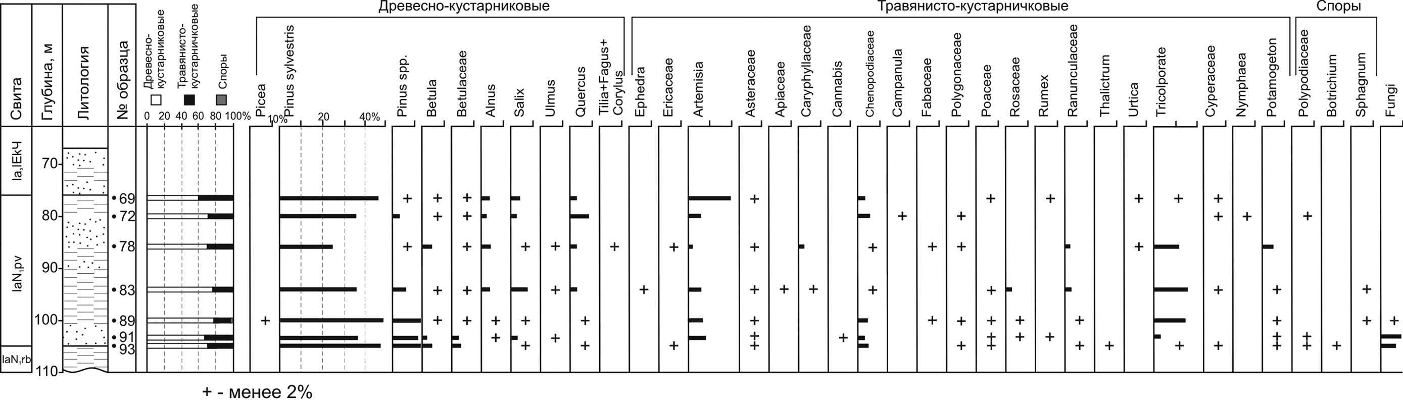 Содержание спор мхов и папоротникообразных составляет 12–51%, пыльцы голосеменных – 5–24%, пыльцы покрытосеменных – 40–73%, микрофитопланктона – 0–4%.