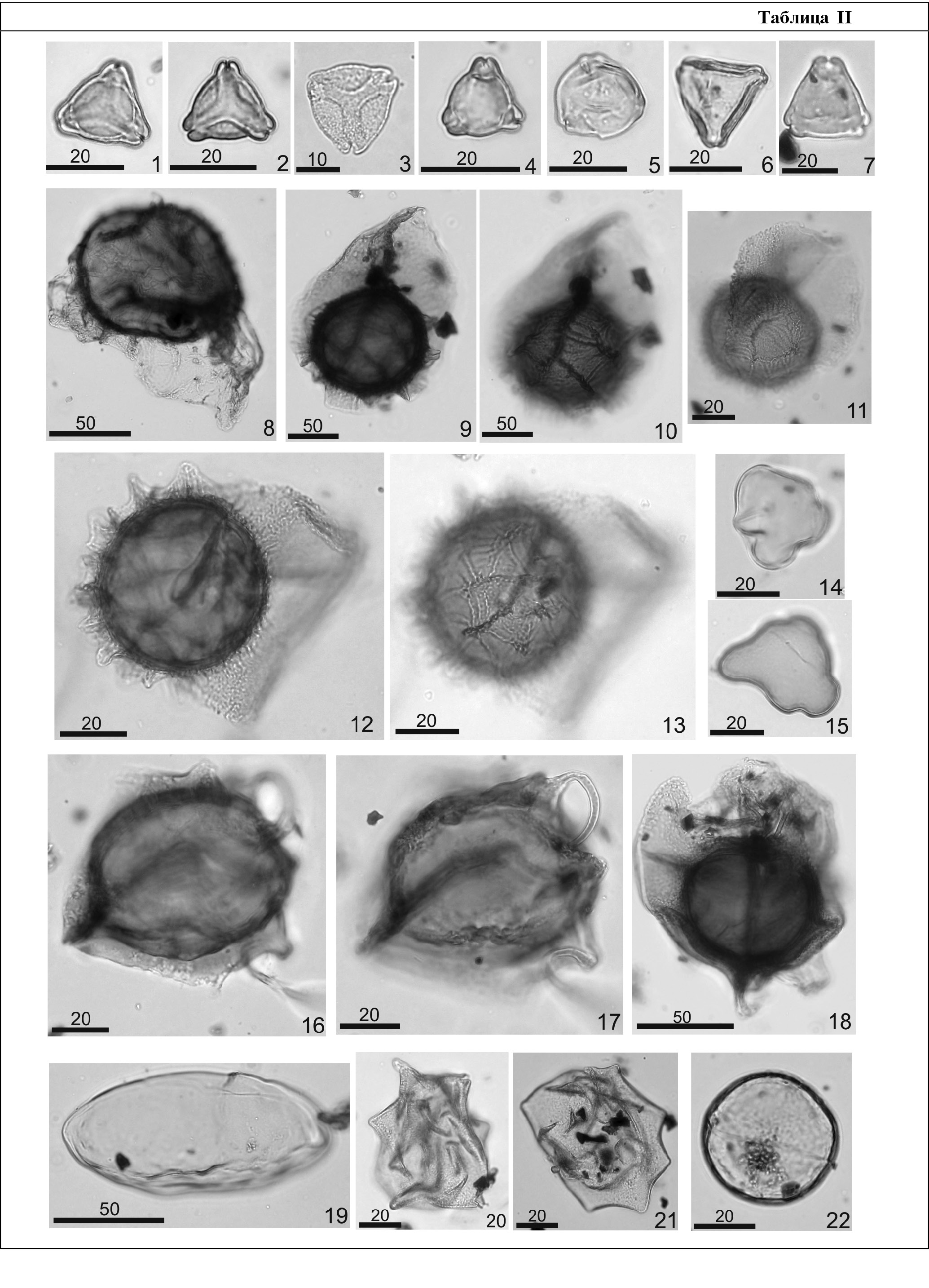 1, 2 – Plicapollis serta Pflug, гл. 237.1 м, обр. 42; 3 – Plicapollis retusus Tschudy, гл. 253.4 м, обр. 37; 4 – Extrariporopollenites sp., гл. 237.1 м, обр. 42; 5 – Betulaceae/Myricaceae, гл. 253.4 м, обр. 38; 6 – Triporopollenites plicoides Zaklinskaja, гл. 253.4 м, обр. 38; 7 – Momipites coryloides Wodehouse, гл. 253.4 м, обр. 37; 8 – Balmeisporites glenelgensis Cookson et Dettmann, гл. 350.6 м, обр. 14; 9, 10, 11 – Ghoshispora kondinskayae (Srivastava et Binda) Srivastava, гл. 253.4 м, обр. 37; 12, 13 – Ghoshispora aff. bella (Kondinskaya) Srivastava, гл. 253.4 м, обр. 37; 14, 15 – Microphytofossils gen. indet., гл. 253.4 м, обр. 37; 16, 17 – Ariadnaesporites sp., гл. 253.4 м, обр. 37; 18 – Megaspore gen. indet., гл. 253.4 м, обр. 37; 19 – Ovoidites sp., гл. 253.4 м, обр. 38; 19, 20, 21 – Microphytofossils indet., гл. 253.4 м, обр. 37; 22 – Schizosporis sp., гл. 241.3 м, обр. 40.