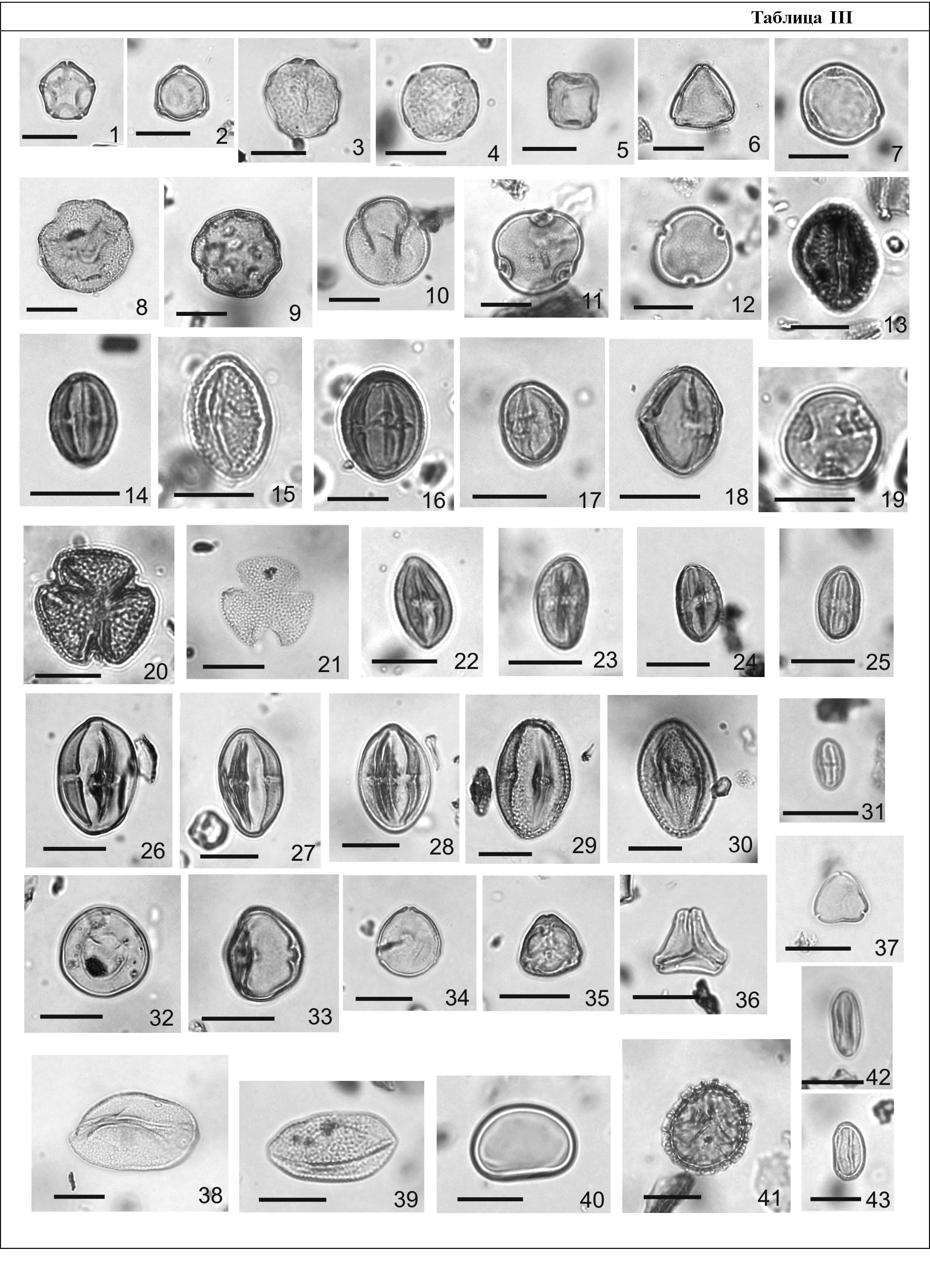 1 – Alnus sp.; 2 – Corylus sp.; 3, 4 – Ulmus sp.; 5 – Ulmoideipites sp.; 6 – Triatriopollenites sp.; 7 – Platycaryapollis sp.; 8, 9 – Liquidambar sp.; 10 – Quercus sparsa; 11, 12 – Tilia sp.; 13 – Rhoipites sp.; 14 – Tricolporopollenites sp.; 15 – Tricolporopollenites aff. heterobrochatus I. Kulkova; 16 – Rhoipites sp.; 17 – Tricolporopollenites sp.; 18 – Araliaceoipollenites euphorii; 19 – Tricolpopollenites ruptilis I. Kulkova; 20, 29, 30 – Retitricolporites sp.; 21 – Hamamelidaceae; 22–24 – Castanopsis spp., 25 – Tricolporopollenites cingulum; 26–28 – Rhoipites sp.; 31 – Castanea crenataeformis; 32 – Carya sp.; 33 – Nyssa sp.; 34 – Comptonia sp.; 35 – Pompeckjoidaepollenites subhercyinicus; 36 – Loranthus sp.; 37 – Engelhardia sp.; 38, 39 – Liliacidites sp.; 40 – Polypodiaceae; 41 – Lycopodiaceae; 42 – Tricolpopollenites liblarensis; 43 – Quercus gracilis.