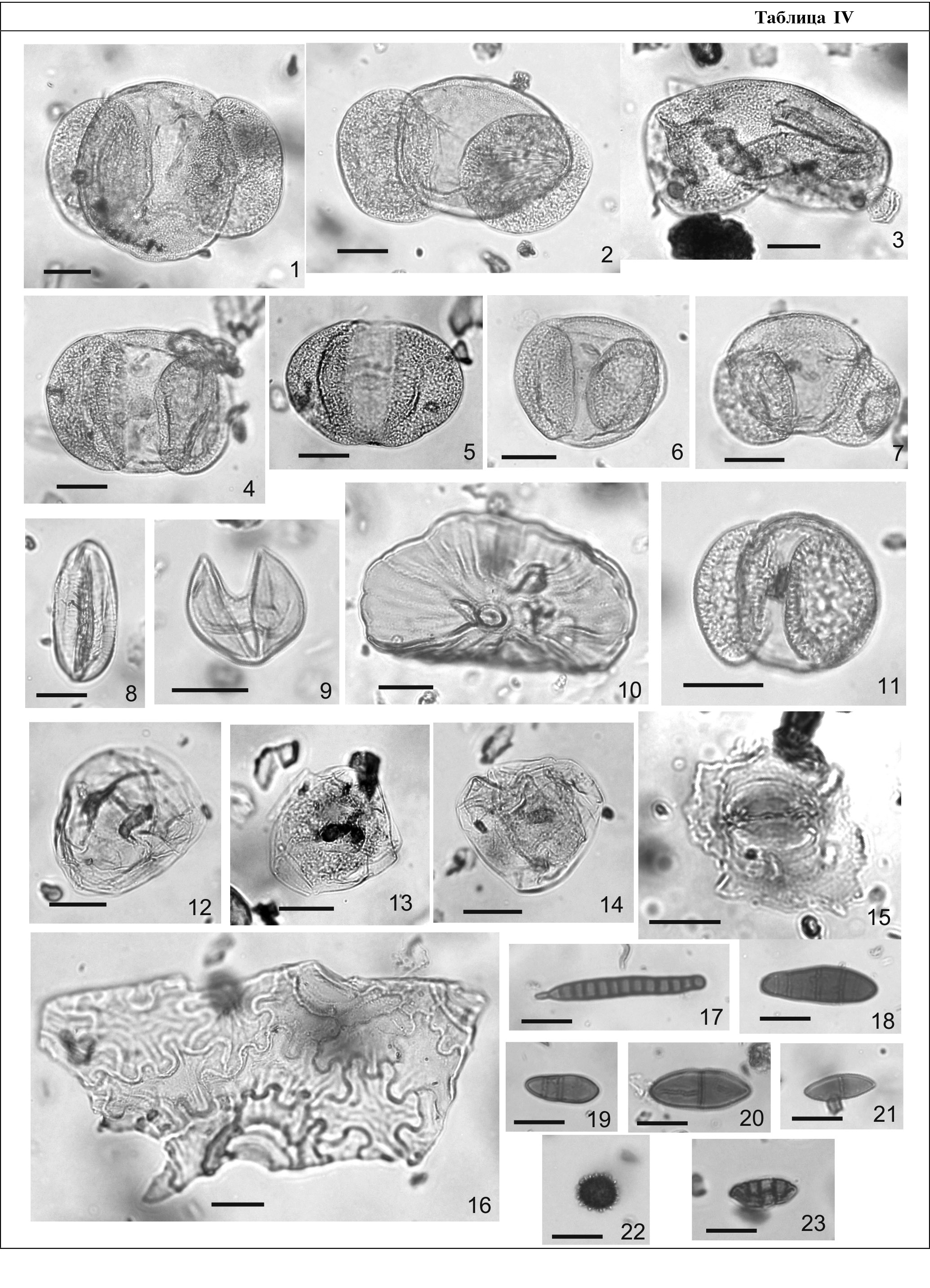 1, 2 – Abies sp.; 3 – Picea sp.; 4, 5 – Pinis s/g Haploxylon; 6, 7, 11 – Pinis s/g Diploxylon; 8 – Ephedra sp.; 9 – Taxodiaceae/Cupressaceae; 10 – Fruiting bodies; 12–14 – Microptytoplankton gen. et sp. indet.; 15 – Coniferales stomata; 16 – эпидермис Pinaceae; 17–23 – Fungal spore: 17–19 – Multicellata-type, 20, 21 – Dicellata-type, 22 – Ustilago (?)-type, 23 – Alternaria-type.
