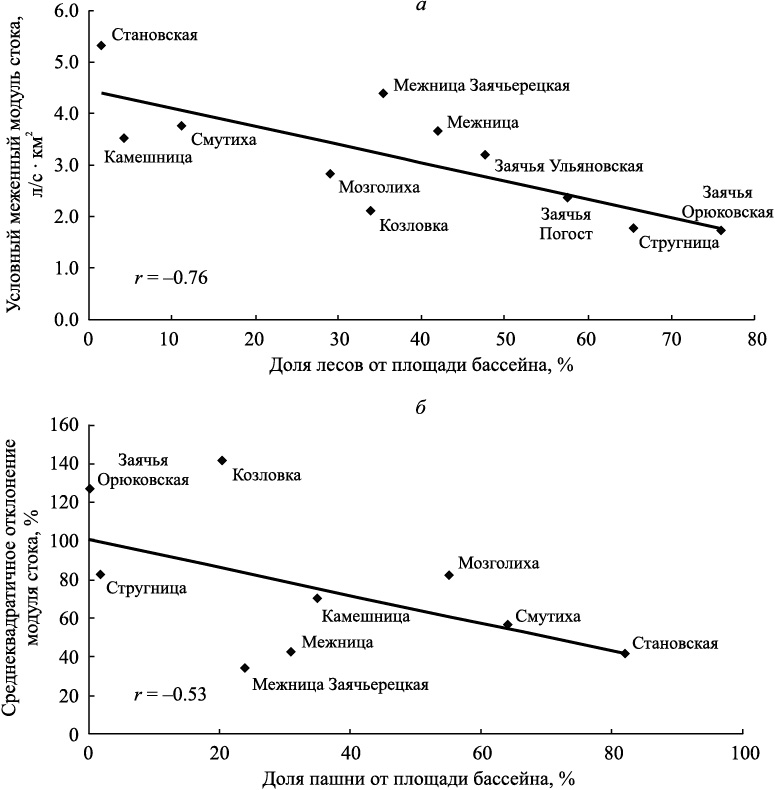 Относительная изменчивость модуля стока (среднеквадратическое отклонение измеренных значений), рассчитанная с учетом данных, относящихся к устойчивой межени, снижается по мере роста распаханности бассейна (рис. 2, б), но увеличивается при росте лесистости. Это свидетельствует о двух противоположных ситуациях, способствующих росту изменчивости модуля стока: полной залесенности и почти полной распаханности бассейна. При некоторых промежуточных соотношениях угодий сток стабилизируется, что давно отмечалось в литературе [7]. Невысокий коэффициент корреляции между распаханностью водосборов и относительной изменчивостью модулей стока объясняется зависимостью последней характеристики от размера реки. Известно, что с ростом размера водотока изменчивость гидрологических характеристик снижается. Если представить среднеквадратичное отклонение меженных модулей стока как функцию двух переменных: порядка реки и распаханности бассейна, то коэффициент множественной корреляции составит 0.64.
