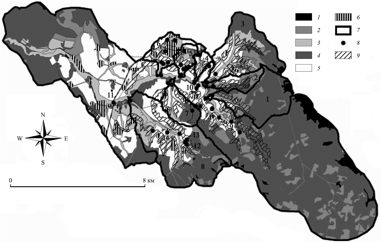 1 — болота, 2 — лесная поросль и молодняки до 20 лет, 3 — залежи и луга, 4 — леса, 5 — пашни, 6 — застроенные и запечатанные территории, 7 — границы бассейнов, 8 — точки отбора проб, 9 — крутые склоны с выходами мергелей.